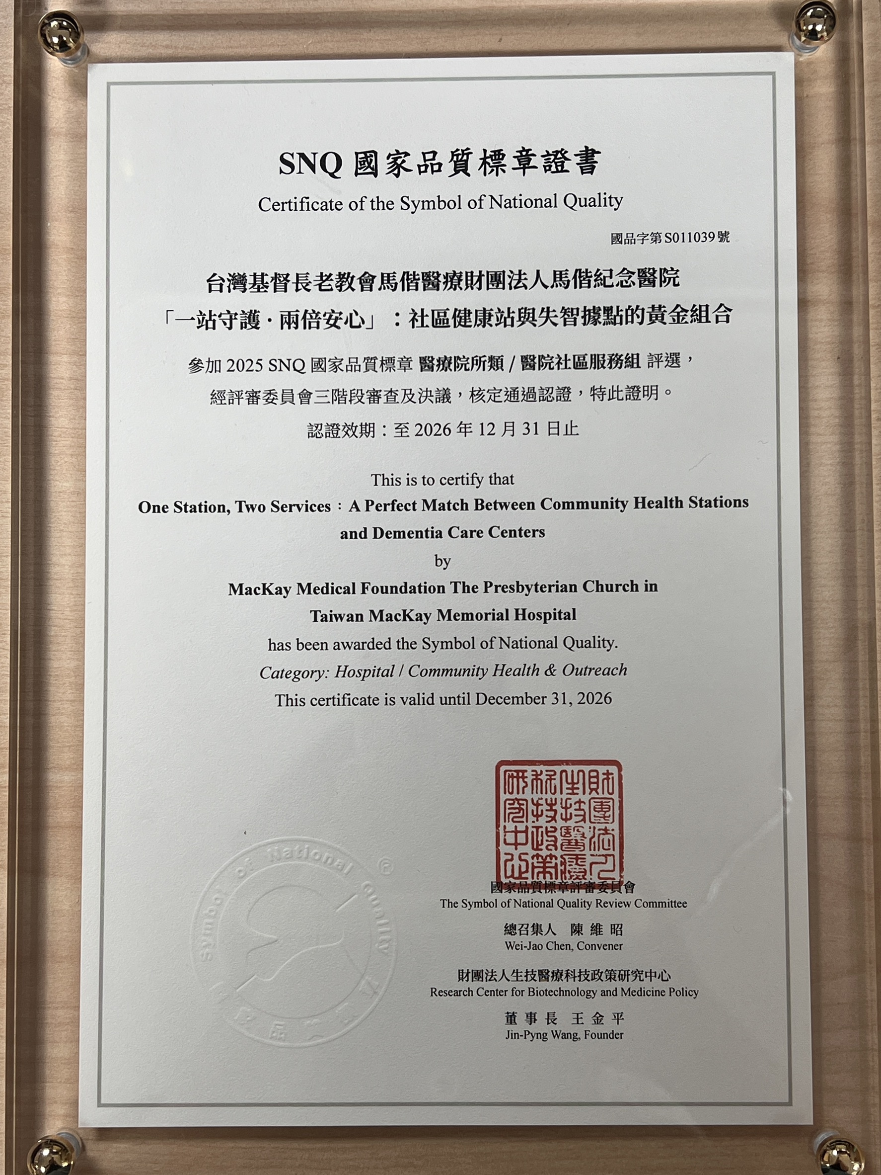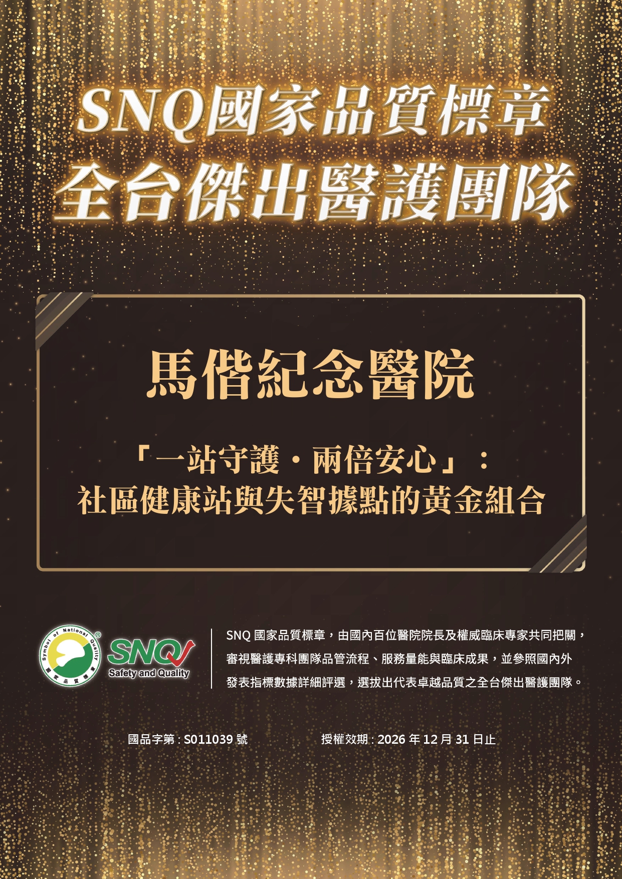 馬偕醫院台北社區醫學中心以「一站守護.兩倍安心」:社區健康站與失智據點的黃金組合專題參加評選,榮獲2025 SNQ 國家品質標章認證。