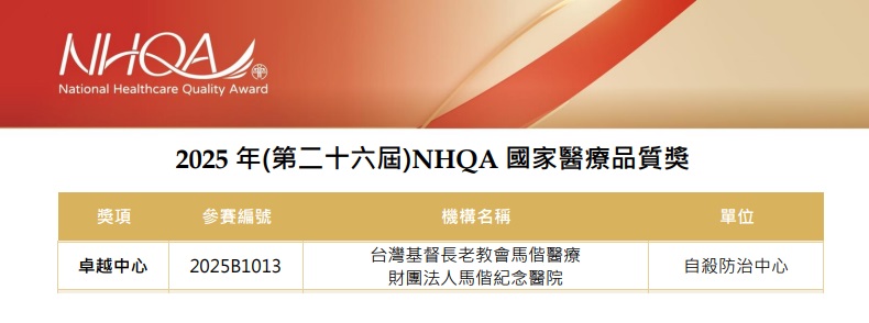 「自殺防治中心」獲國家醫療品質獎系統類【卓越中心】肯定!