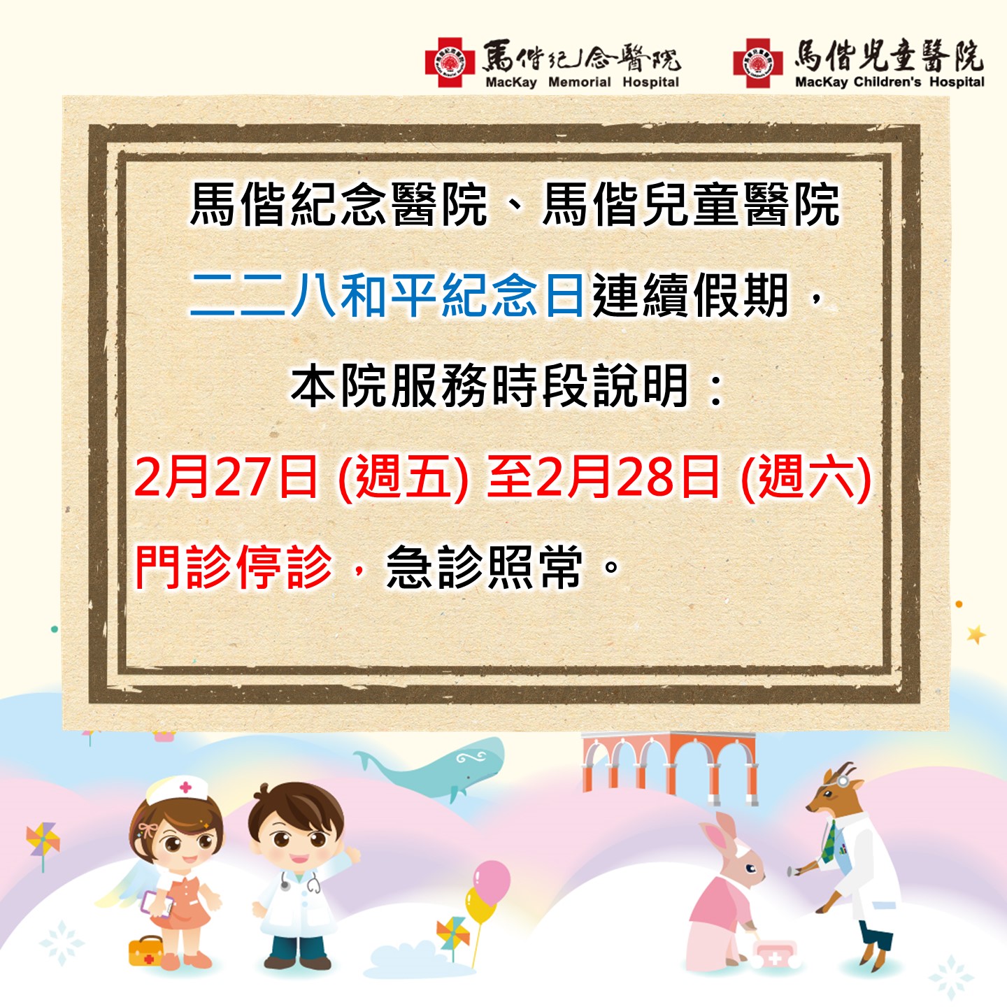 二二八和平紀念日連續假期,本院服務時段說明
