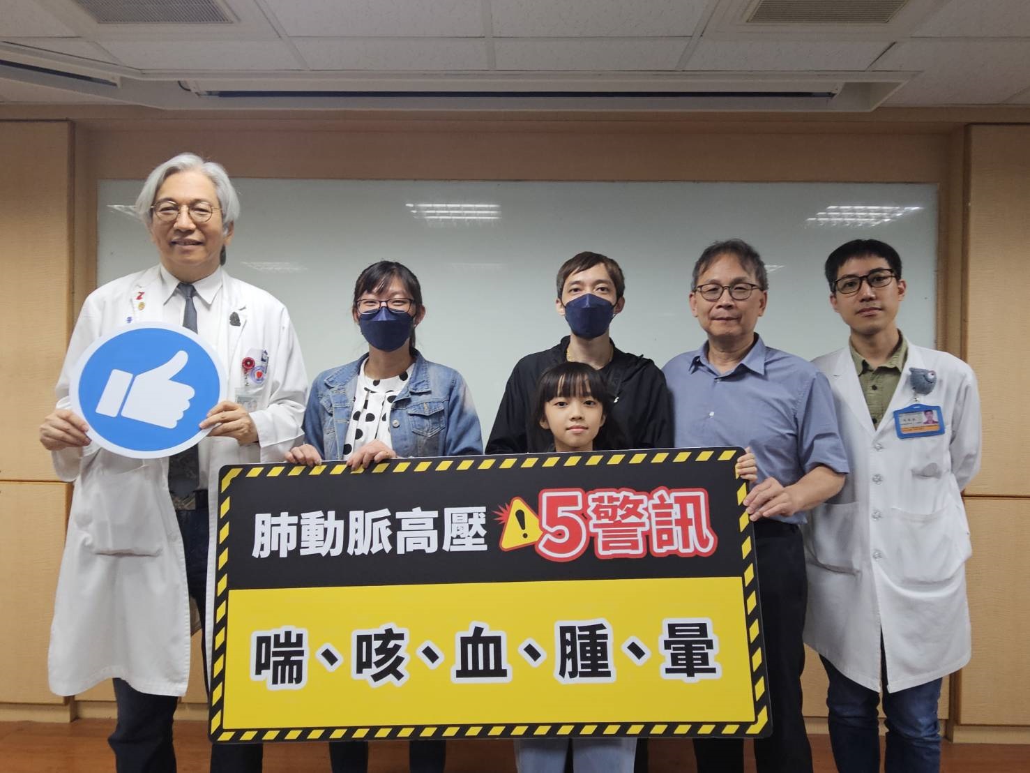 ▲馬偕紀念醫院心血管預防暨肺循環醫學科主任吳懿哲(左起)、吳小姐一家人、馬偕紀念醫院復健科主任胡國琦、心臟血管內科資深主治醫師吳書豪一同呼籲民眾勿漠視肺動脈高壓五警訊「喘、咳、血、腫、暈」。
