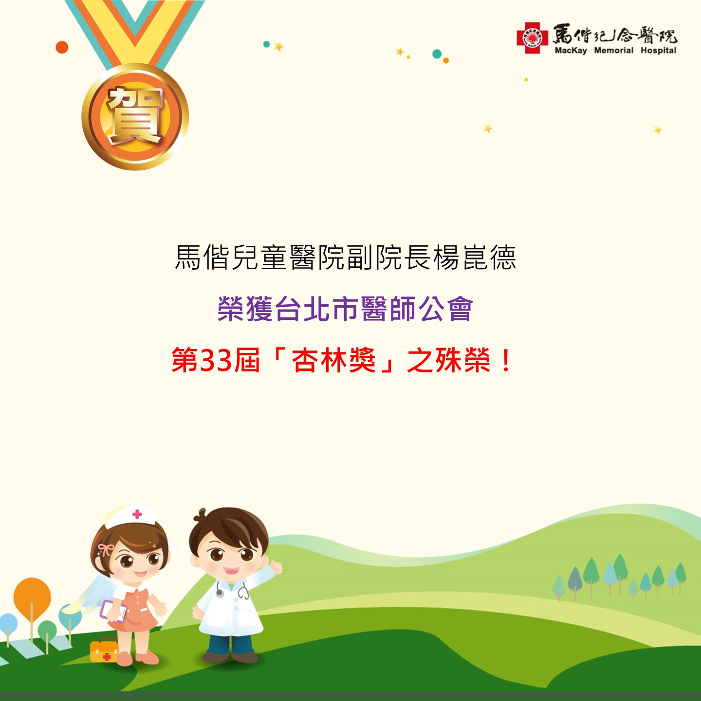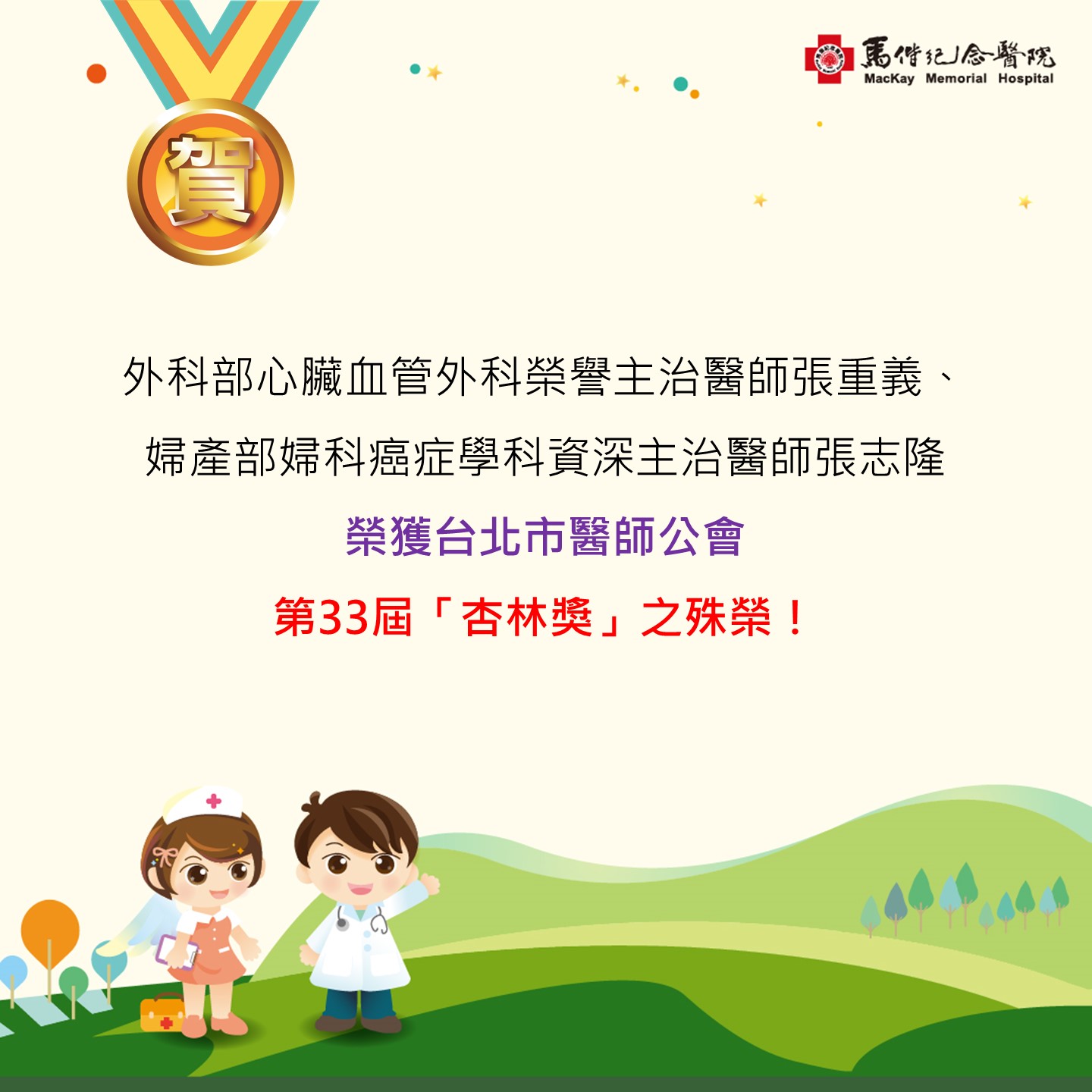 賀!馬偕紀念醫院外科部心臟血管外科榮譽主治醫師張重義、婦產部婦科癌症學科資深主治醫師張志隆、馬偕兒童醫院副院長楊崑德,榮獲台北市醫師公會第33屆「杏林獎」。