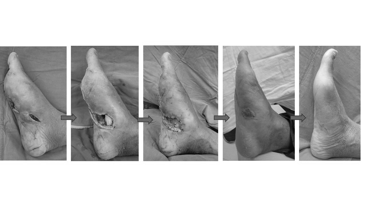 一個小傷口竟可能會失去一條腿?50歲的汪先生在工作時不慎割傷左腳,因疏於傷口照護,幾天後出現潰瘍,直至腳部紅腫擴大並開始發燒畏寒等症狀,就醫後發現是糖尿病足併發壞死性筋膜炎,由經馬偕紀念醫院急診醫學部與整形外科即時處置,並啟動傷口照護中心採用跨團隊照護流程,歷經數次手術、下肢動脈介入、高壓氧治療與再生型敷料等治療,終於保住左腳免除截肢。