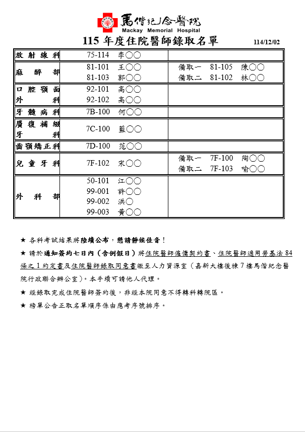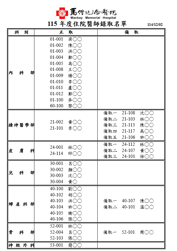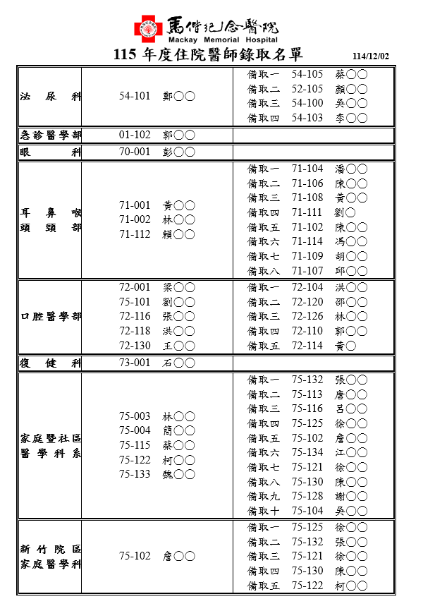 115年度馬偕紀念醫院住院醫師錄取名單