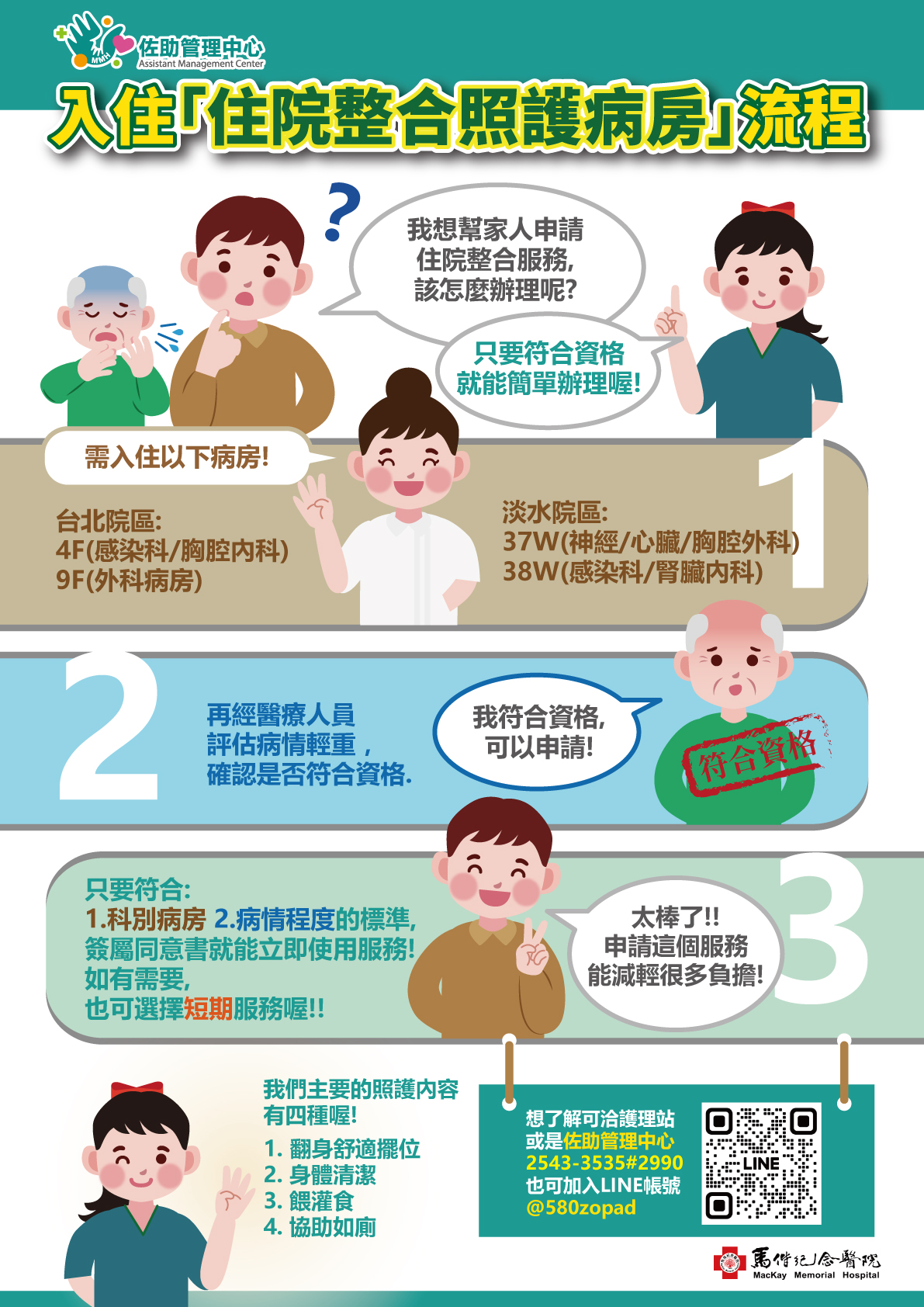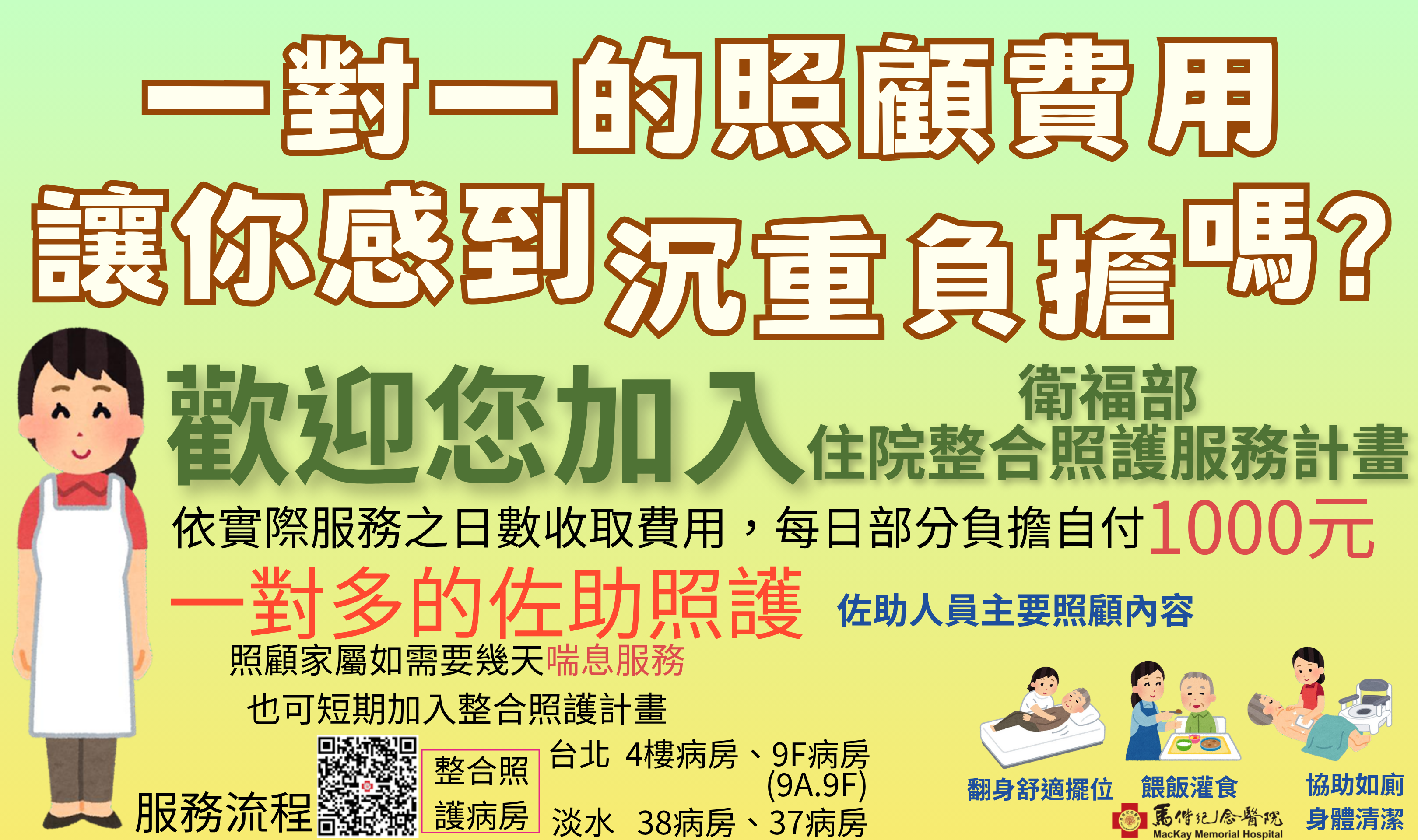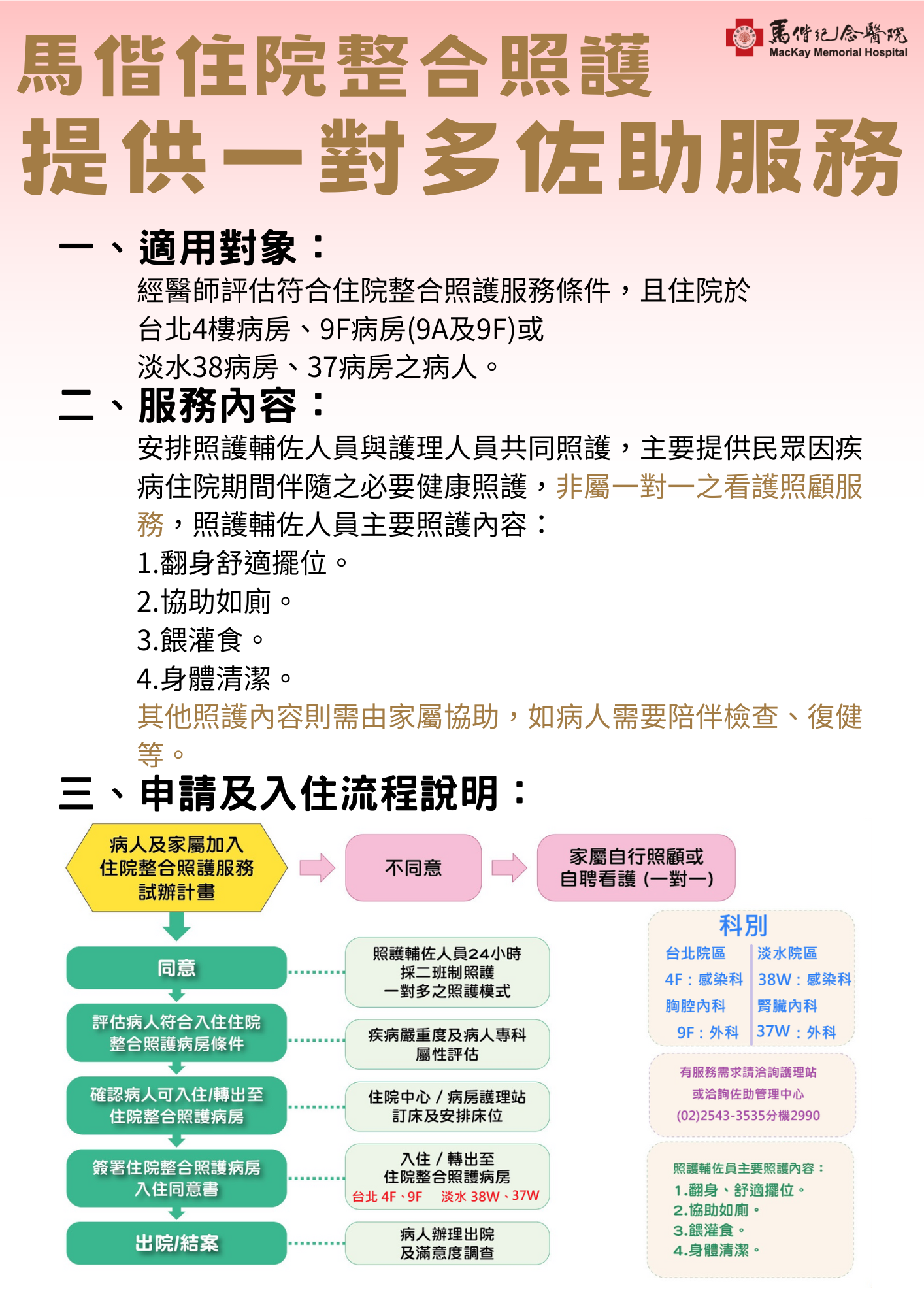 配合衛福部的住院整合照護服務計畫,馬偕安排輔佐照護人員與醫護人員結合形成為團隊, 共同協助因為疾病而入住的民眾在病房期間的健康照護, 以一對多的方式提供四大服務 :