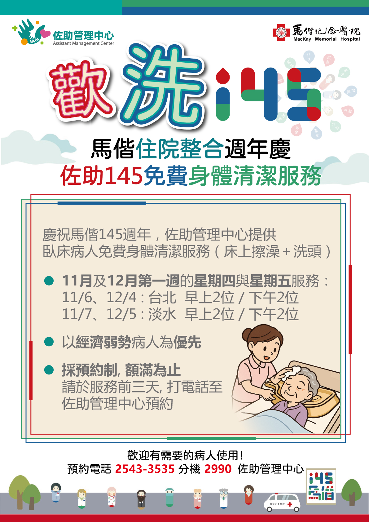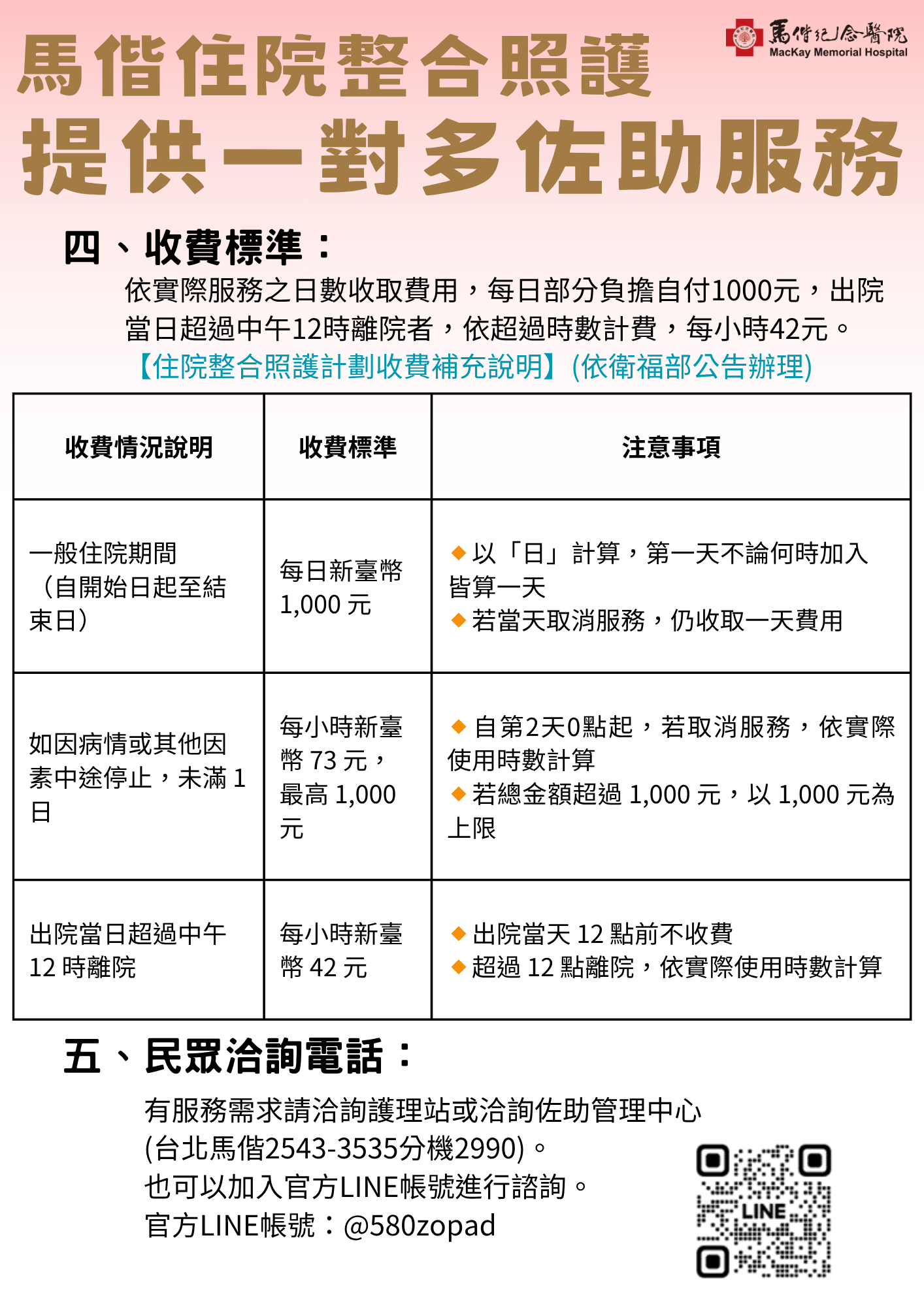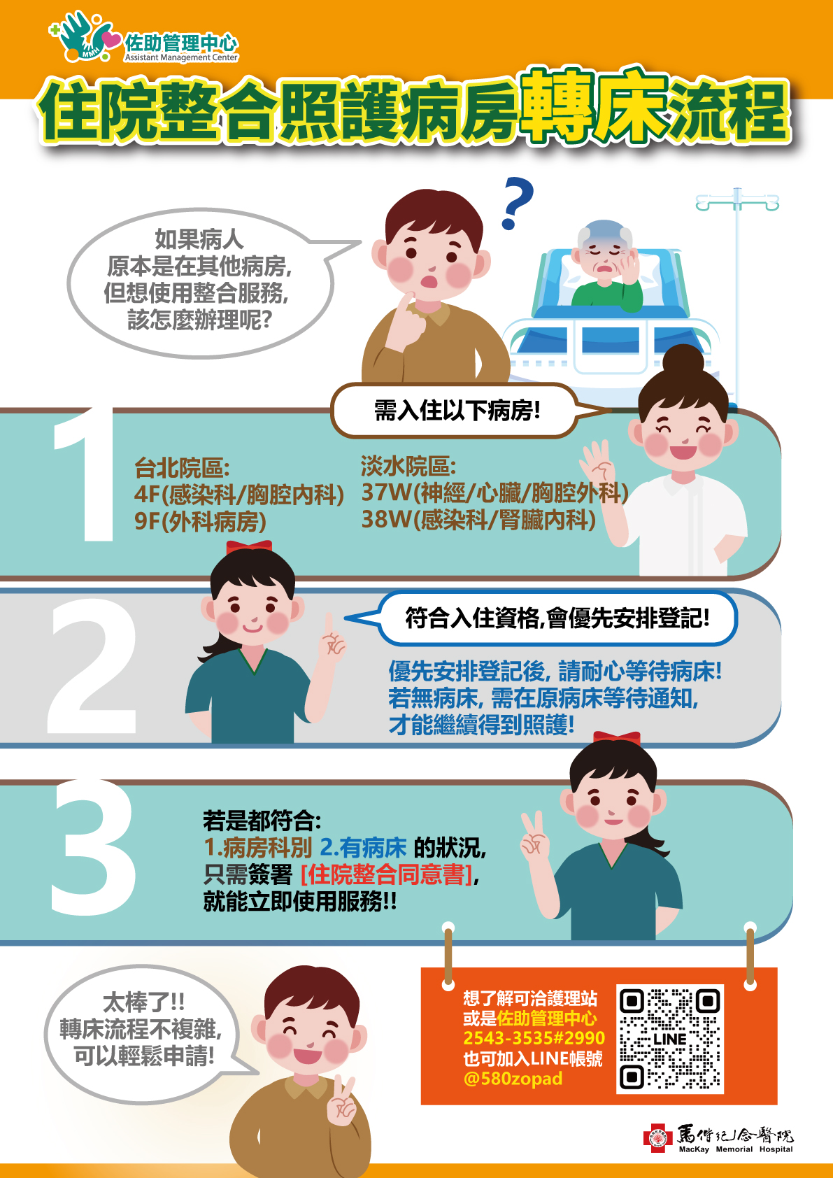配合衛福部的住院整合照護服務計畫,馬偕安排輔佐照護人員與醫護人員結合形成為團隊, 共同協助因為疾病而入住的民眾在病房期間的健康照護, 以一對多的方式提供四大服務 :