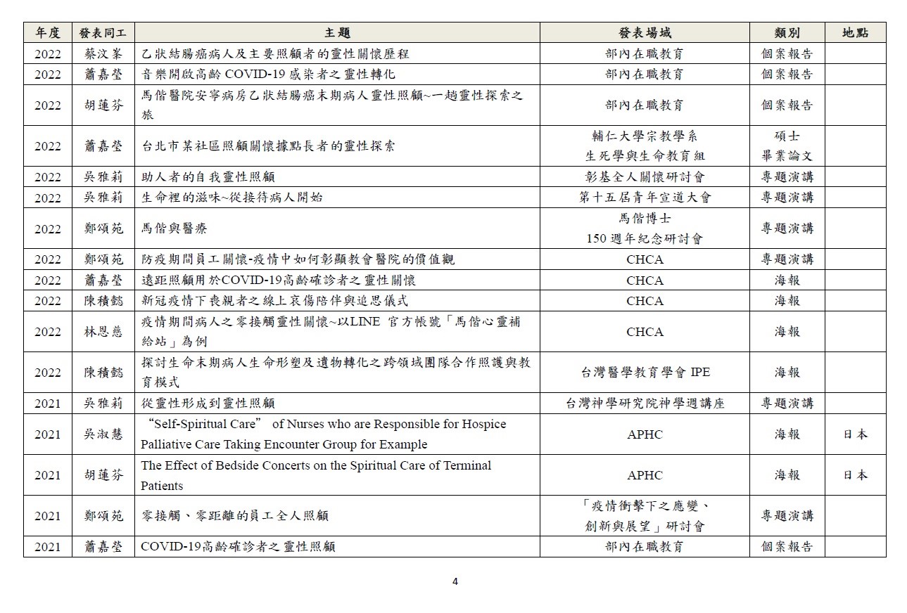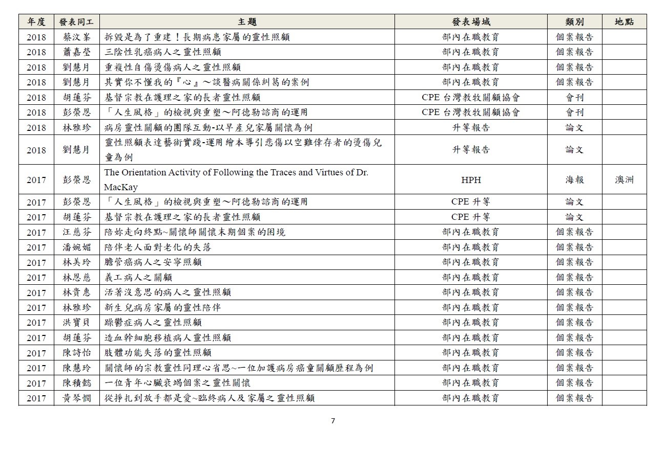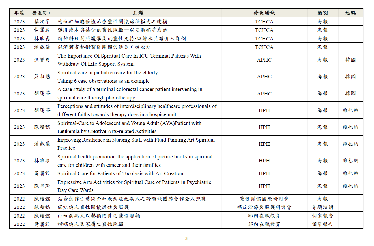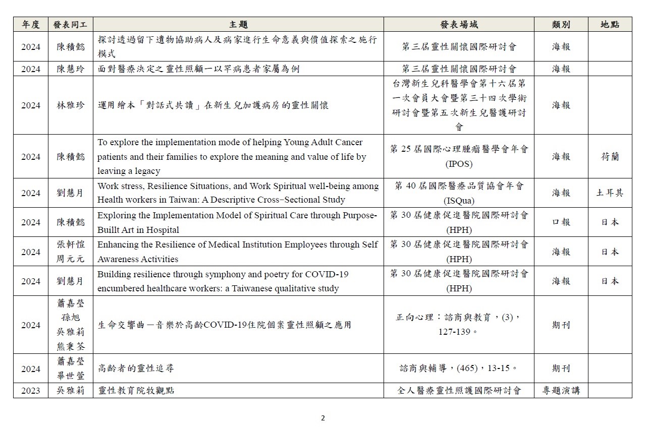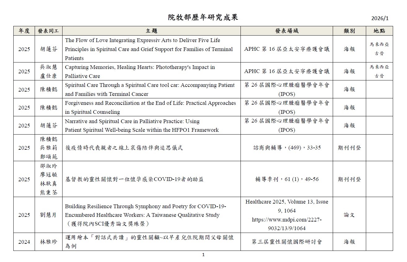 透過研究深化關懷工作,以期建構身、心、社、靈整全的關懷模式。 1.針對臨床關懷定期進行個案研討。 2.於國內、外進行成果報告及經驗分享。 3.與院內、外跨職系團隊進行研究合作。