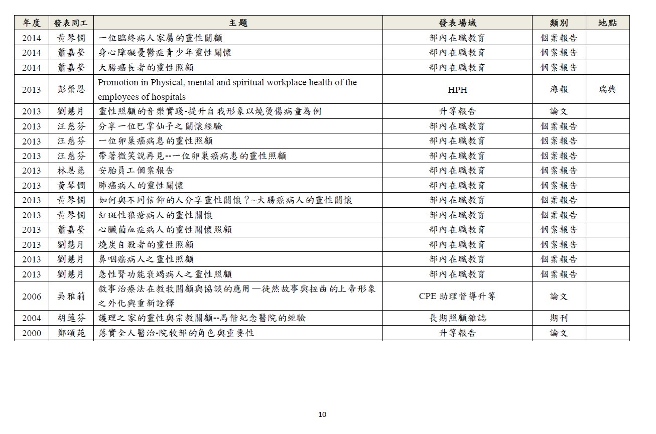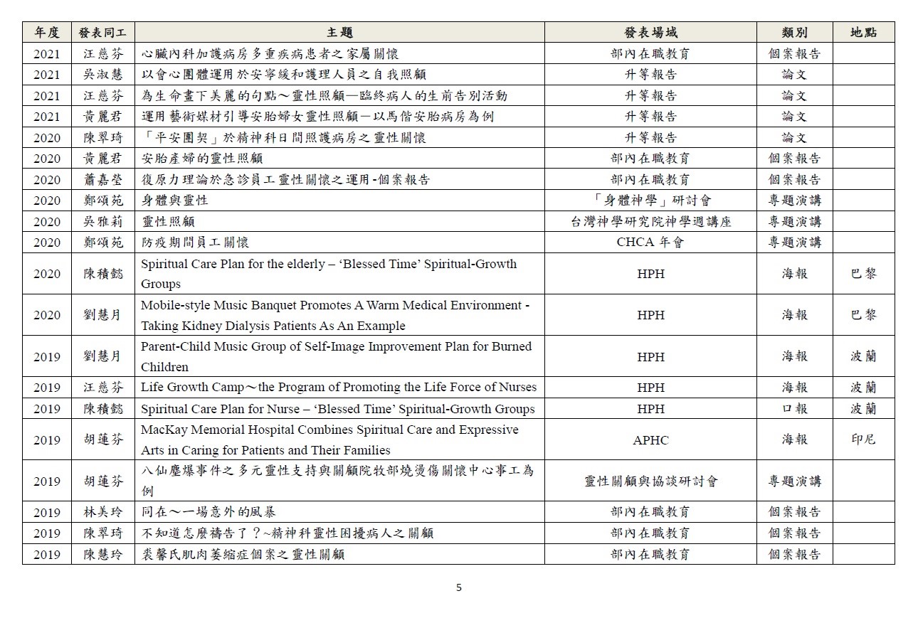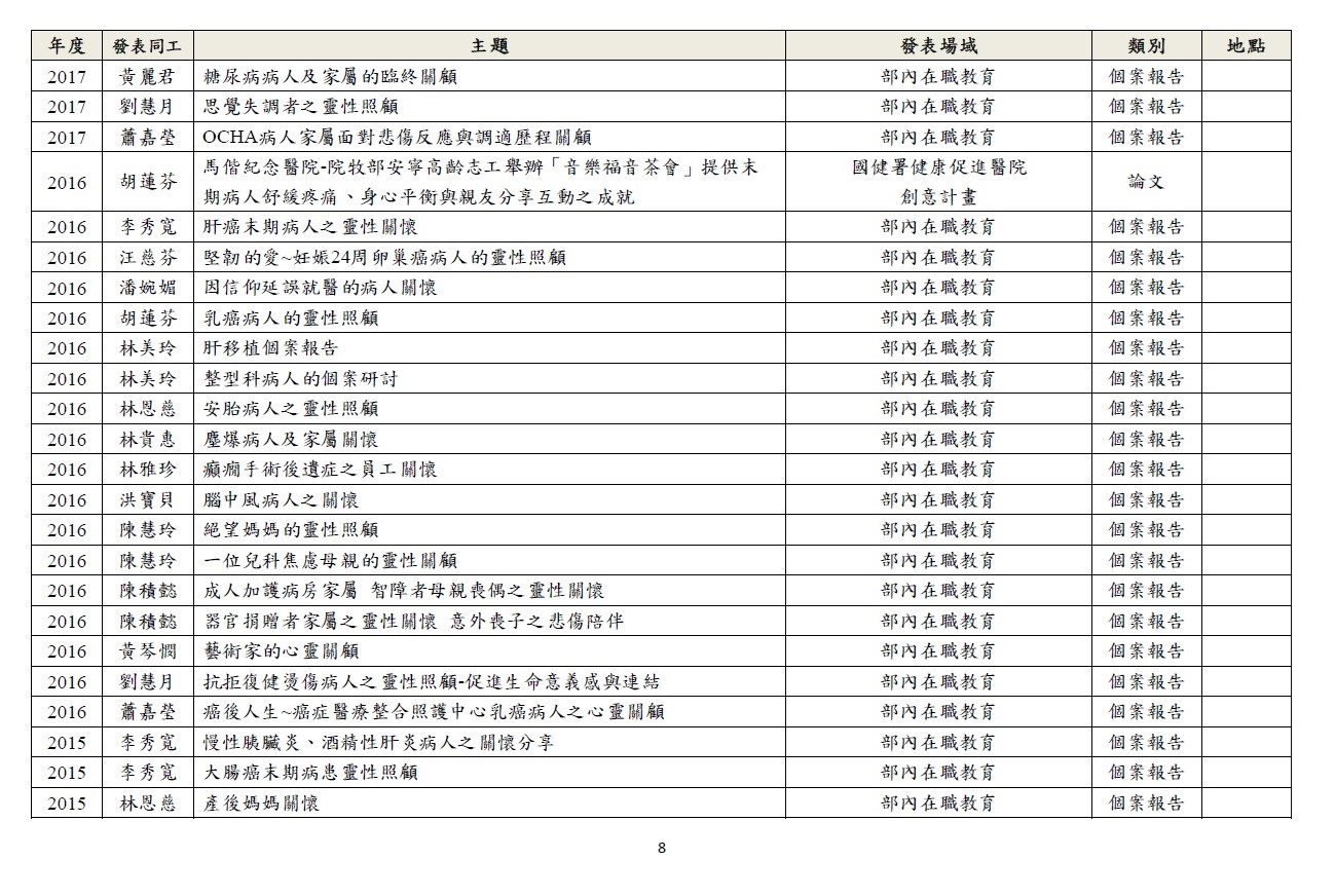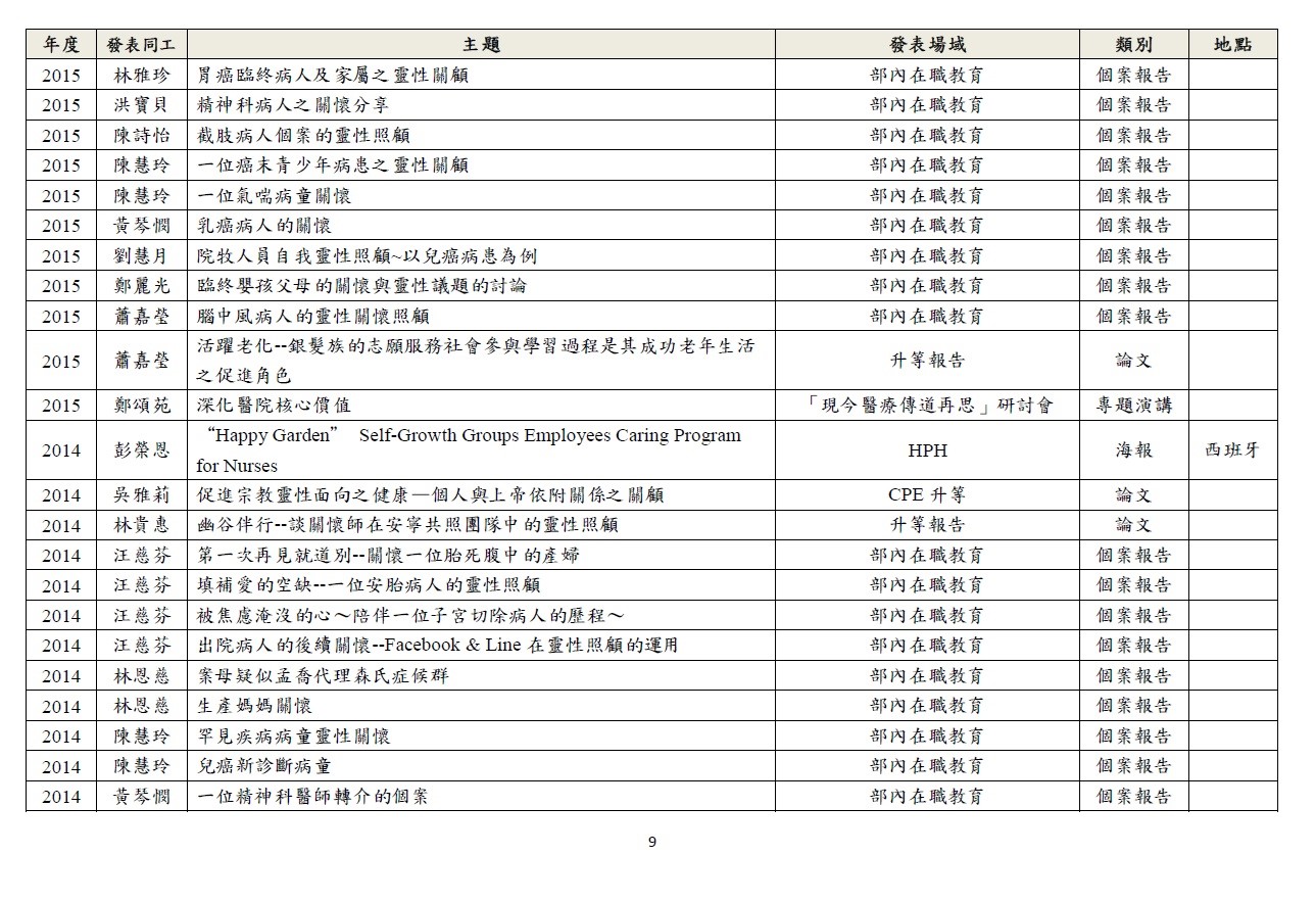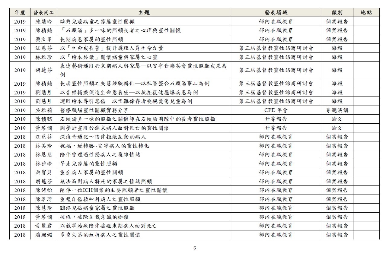 透過研究深化關懷工作,以期建構身、心、社、靈整全的關懷模式。 1.針對臨床關懷定期進行個案研討。 2.於國內、外進行成果報告及經驗分享。 3.與院內、外跨職系團隊進行研究合作。