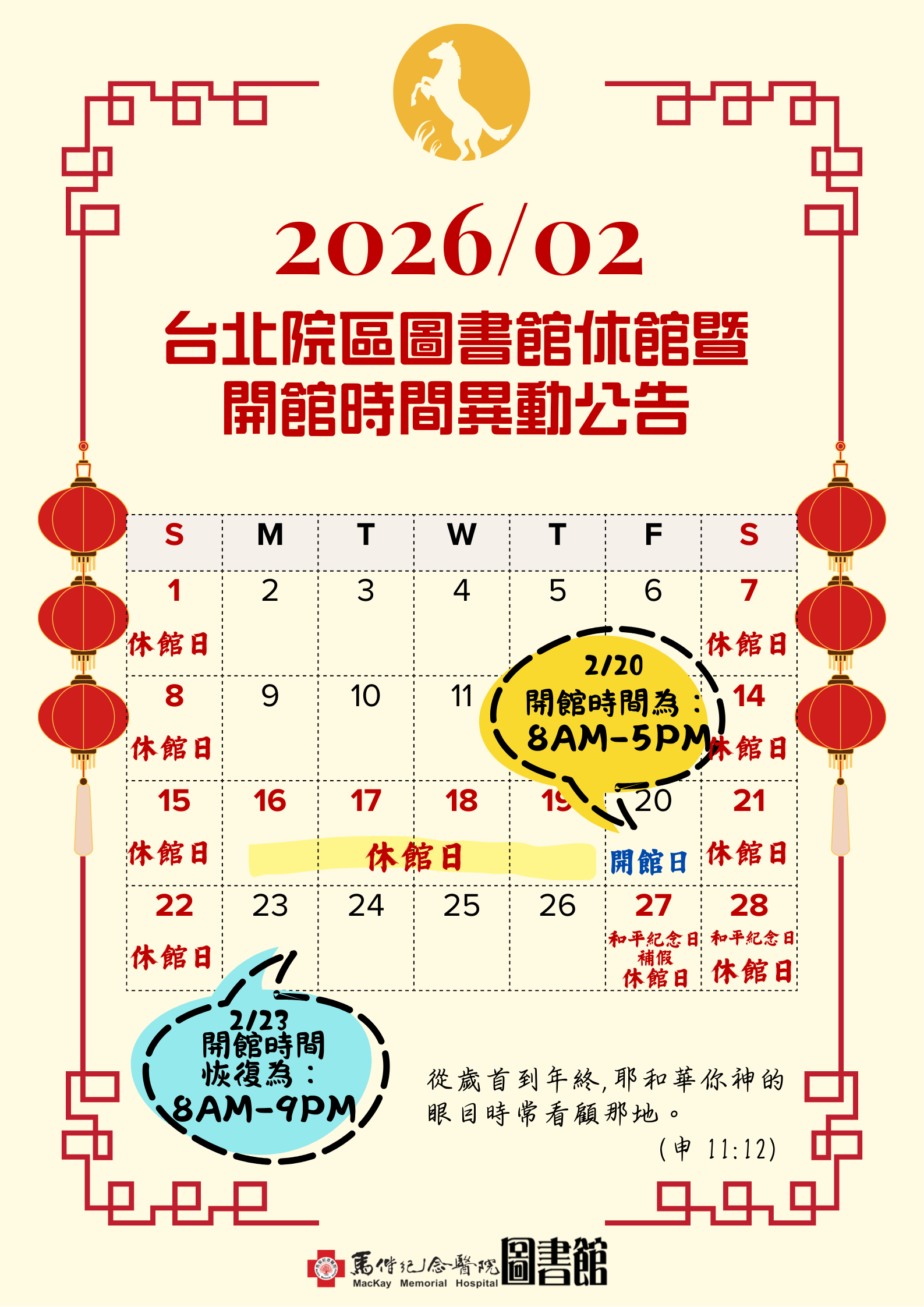 [服務]2026年2月圖書館休館日暨開館時間異動公告