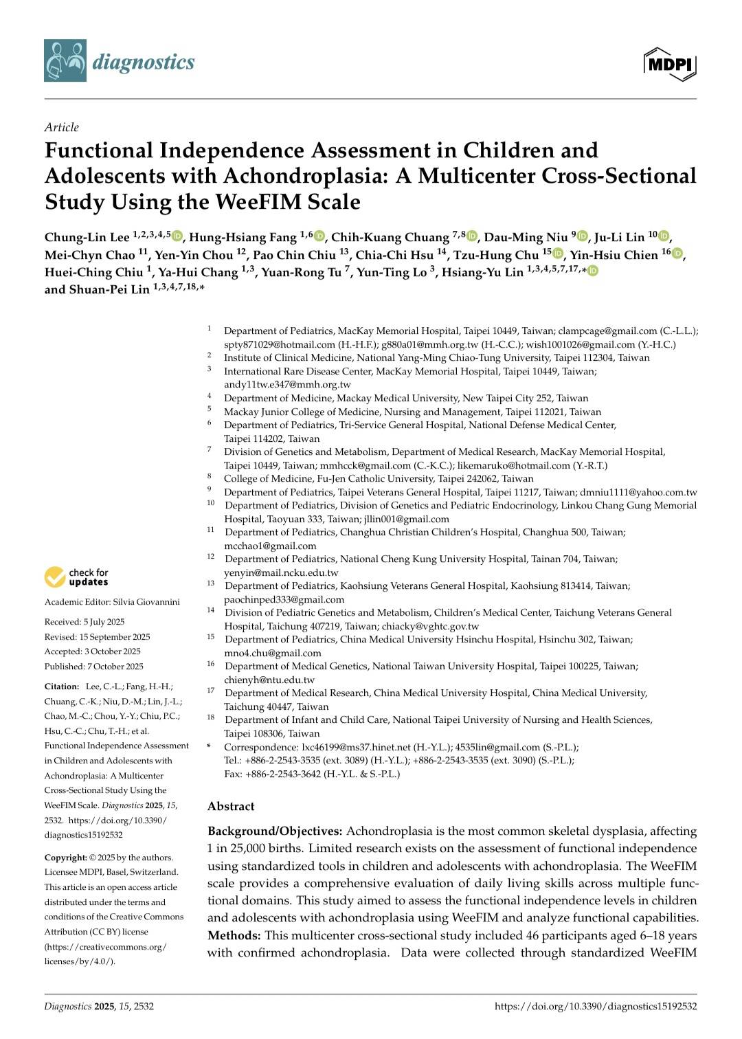 恭賀!馬偕紀念醫院【國際罕見疾病中心】 全人醫療照護暨醫學研究團隊與台灣十家醫學中心遺傳科照護團隊合作之學術論文【軟骨發育不全症兒童和青少年的功能獨立性評估:一項使用 WeeFIM 量表的多中心橫斷面研究】,今日榮登 SCI 國際醫學期刊 Diagnostics。