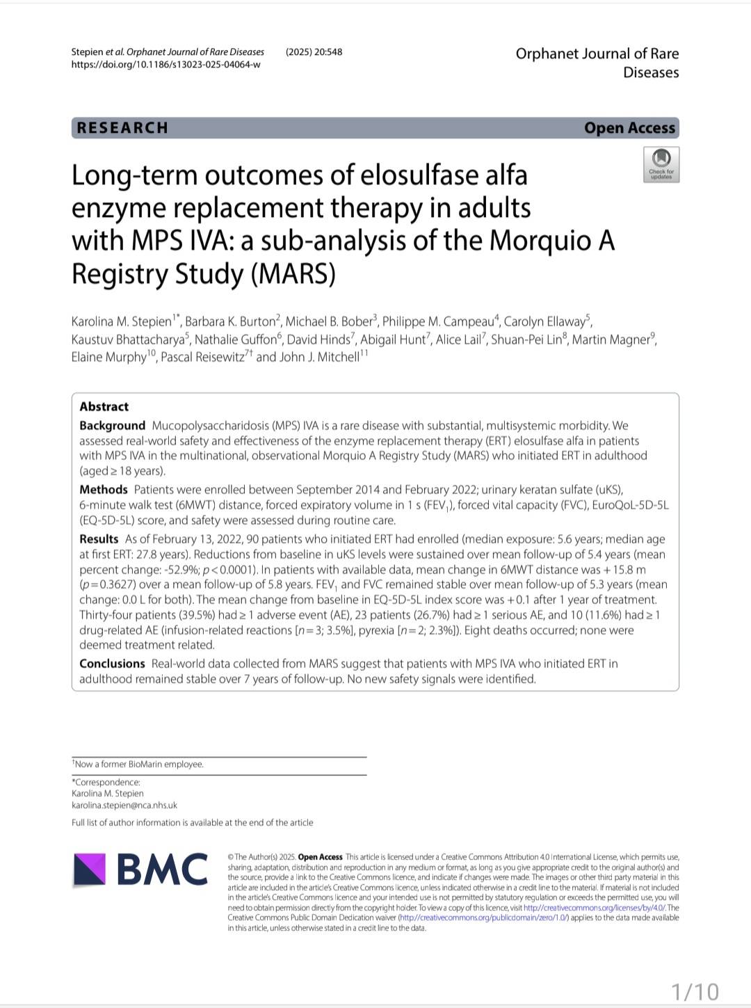恭賀!林炫沛教授代表台灣與國際黏多醣症醫療照護團隊〔國際合作〕之學術論文〔第四A型黏多醣症成年人 elosulfase alfa 酵素替代療法之長期療效:Morquio A 註冊研究 (MARS) 的亞組分析〕,今日榮登 SCI 國際醫學期刊 Orphanet Journal of Rare Diseases。