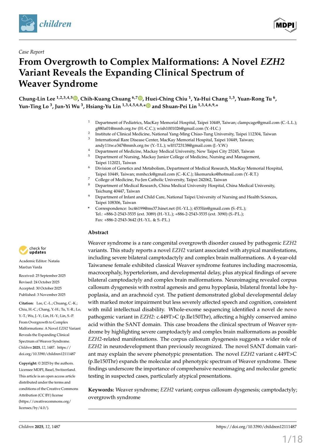 恭賀!馬偕紀念醫院【國際罕見疾病中心】全人醫療照護暨醫學研究團隊之學術論文【從過度生長到複雜畸形:一種新的 EZH2 基因變異揭示了Weaver Syndrome 不斷擴展的臨床光譜】,今日榮登 SCI 國際醫學期刊 Children。