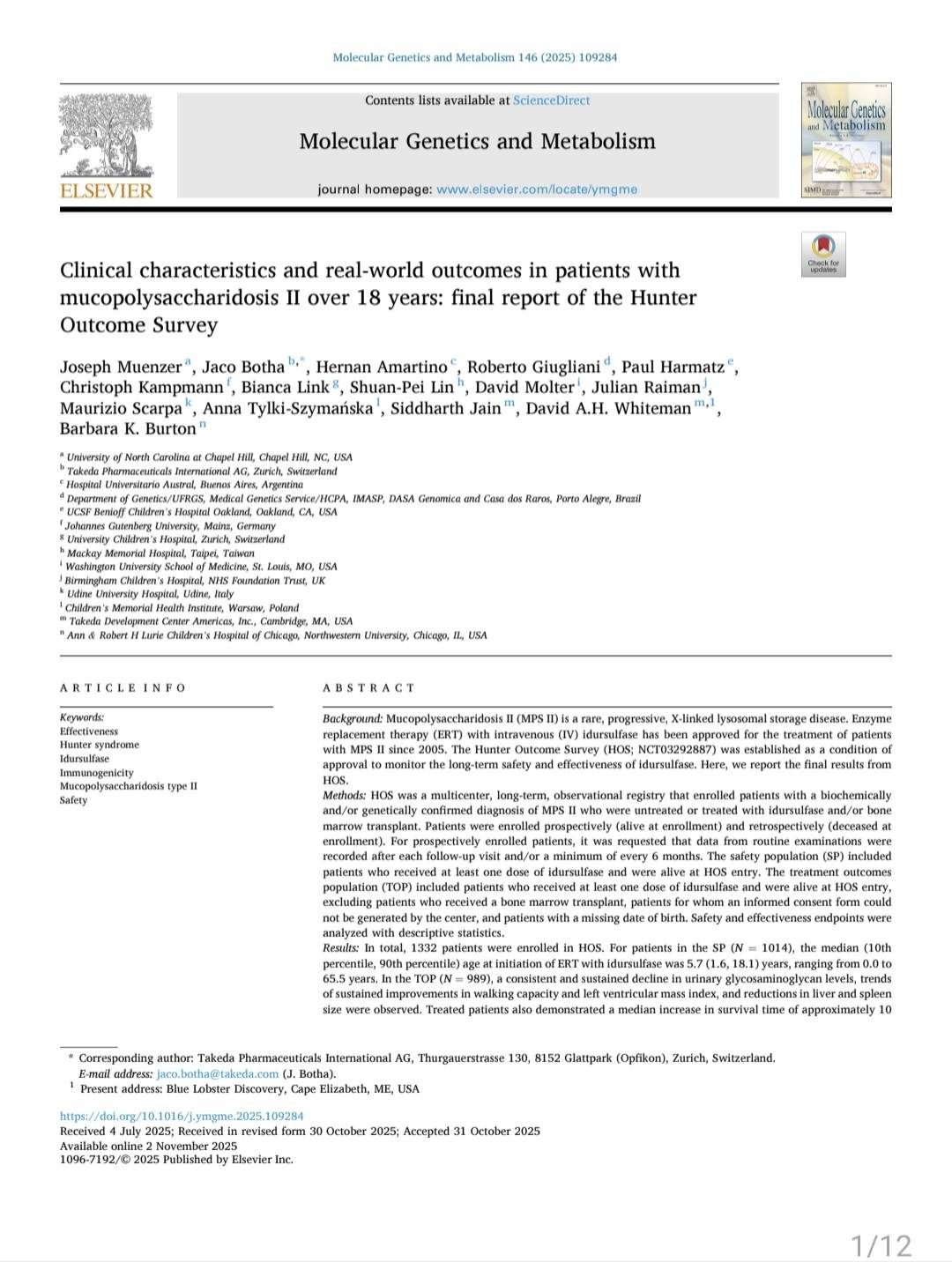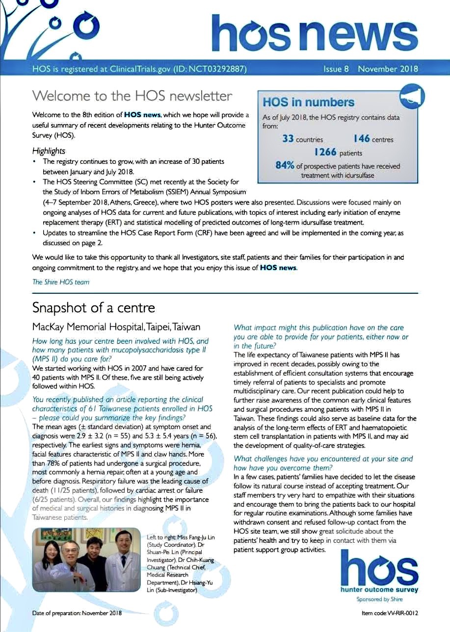 恭賀!馬偕紀念醫院【國際罕見疾病中心】 全人醫療照護暨醫學研究團隊林炫沛教授代表台灣與國際黏多醣症醫療照護團隊〔國際合作〕之學術論文〔第二型黏多醣症患者的臨床特徵與真實世界資訊的18 年追蹤:Hunter Outcome Survey 的總報告〕,今日榮登 SCI 國際醫學期刊 Molecular Genetics and Metabolism。