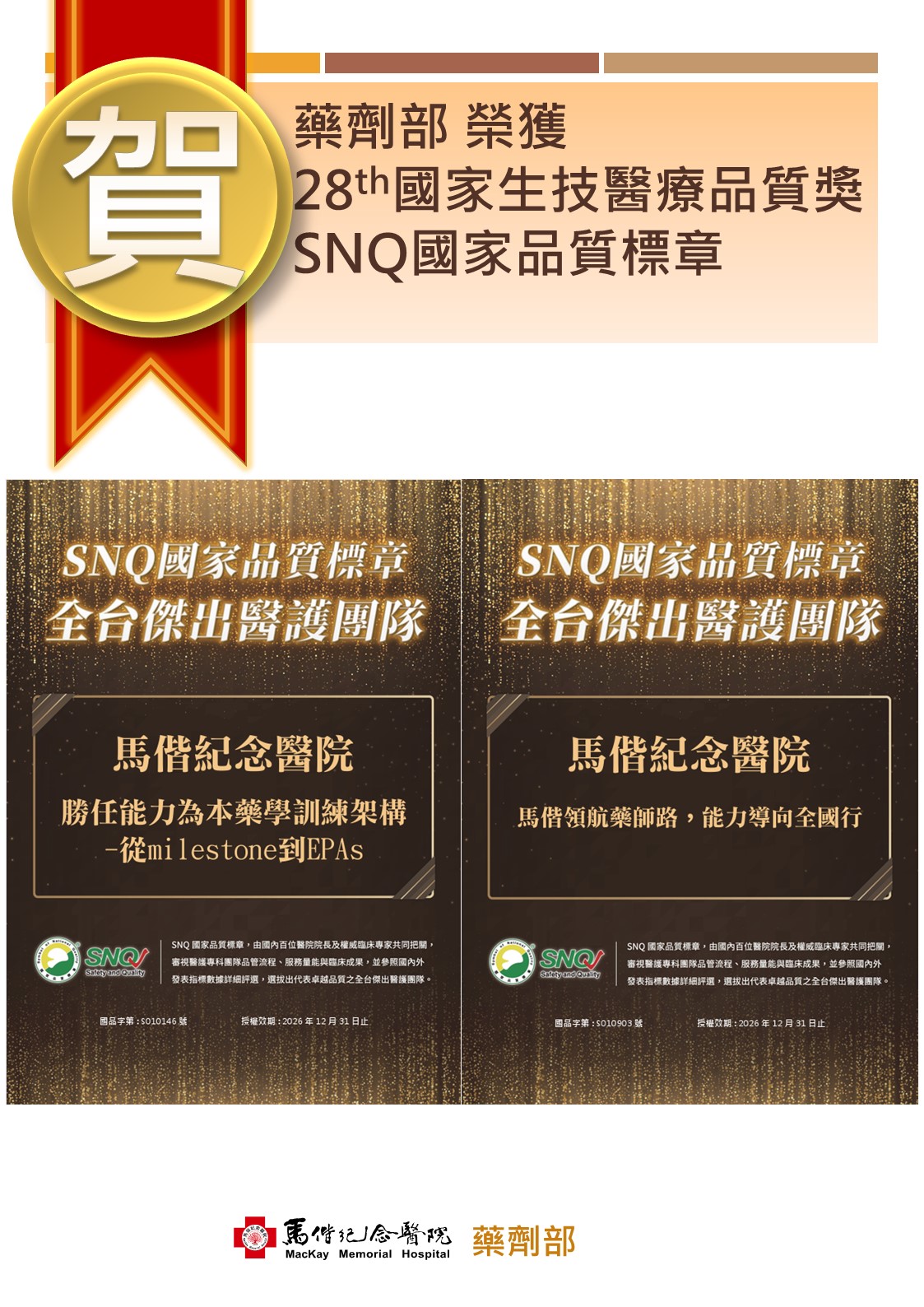 藥劑部以「勝任能力為本藥學訓練架構-從milestone到EPAs」及「馬偕領航藥師路,能力導向全國行」兩項創新藥師訓練方案,榮獲 SNQ 國家品質標章認證,展現本院在藥學教育與醫療品質上的卓越成果。