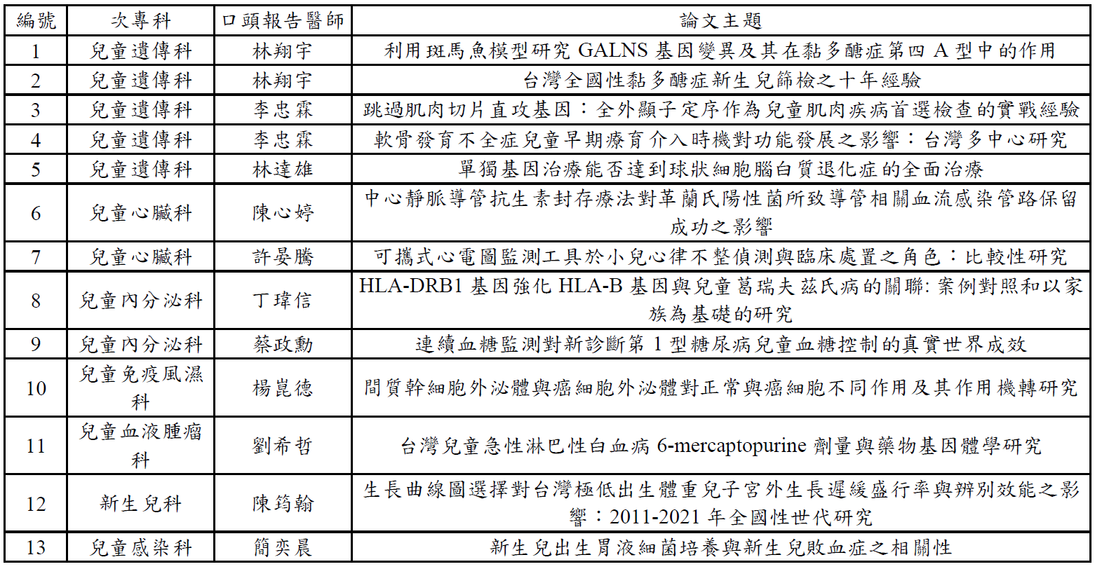 恭賀!臺灣兒科醫學會第266屆學術演講會預定將在2026年4月18-19日於台北國際會議中心舉行。本院兒科醫師此次踴躍投稿研究論文口頭報告,總計共有13篇論文經學術節目委員會審查通過為口頭報告。