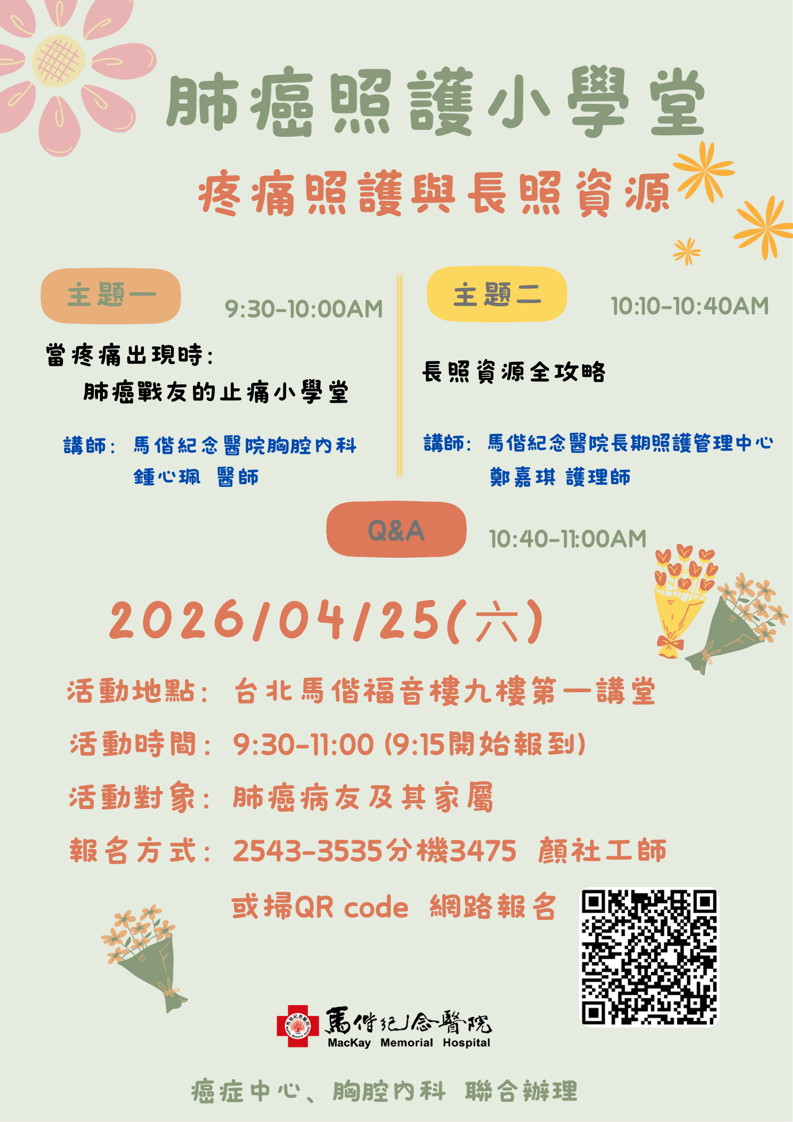 本次「肺癌照護小學堂」邀請專業醫療人員分享疼痛照護與長照資源,提供病友與家屬實用的照護資訊。