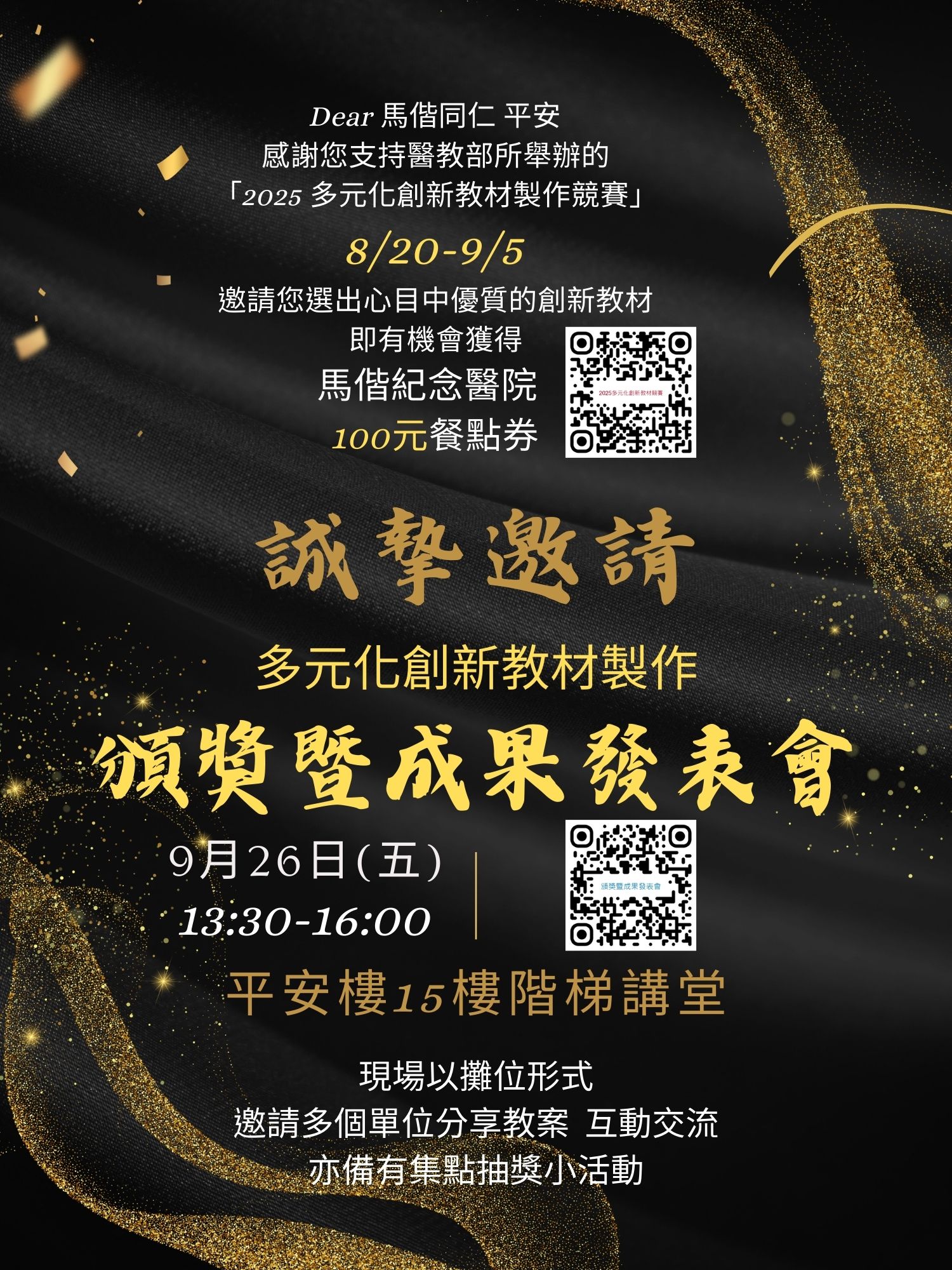 適逢馬偕紀念醫院145周年,醫學教育部將持續推動醫學教育領域的多元化與創新,鼓勵醫學教育者開發適合不同學習者需求的創新教材,並提升其在臨床醫學教學中的應用價值。本競賽強調融合科技、創意與臨床實踐,設計能夠促進學習、提高診療能力及支持醫學專業成長的教育資源。通過醫學教育部審查後納入院內教學指導教材及提供各單位分享使用,提升本院之醫學教育品質。