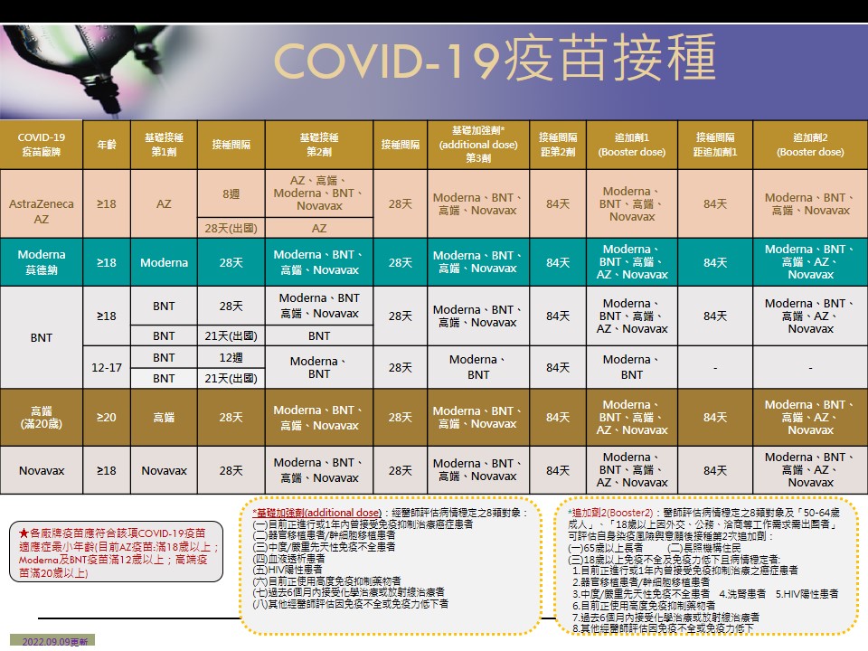 ►依中央疫情指揮中心公告,自2022/09/12起,調整疫苗施打週期如下:
