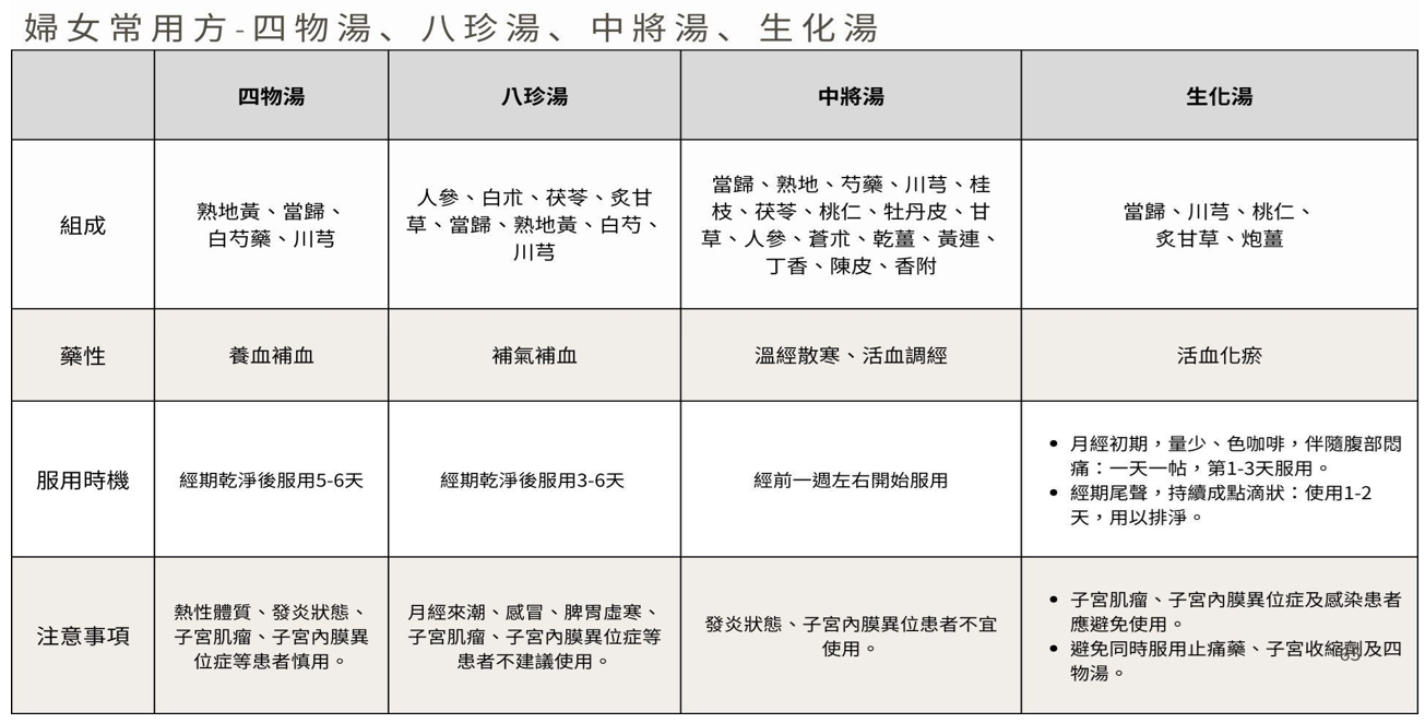 - 八珍湯:是由四物湯和四君子湯所組成的,既能補血也能補氣,常用於病後調養使用。在月經補養上,與四物湯相同,應月經結束後再使用,約結束後三到五天。另外,感冒或腸胃虛寒的患者不宜使用。
