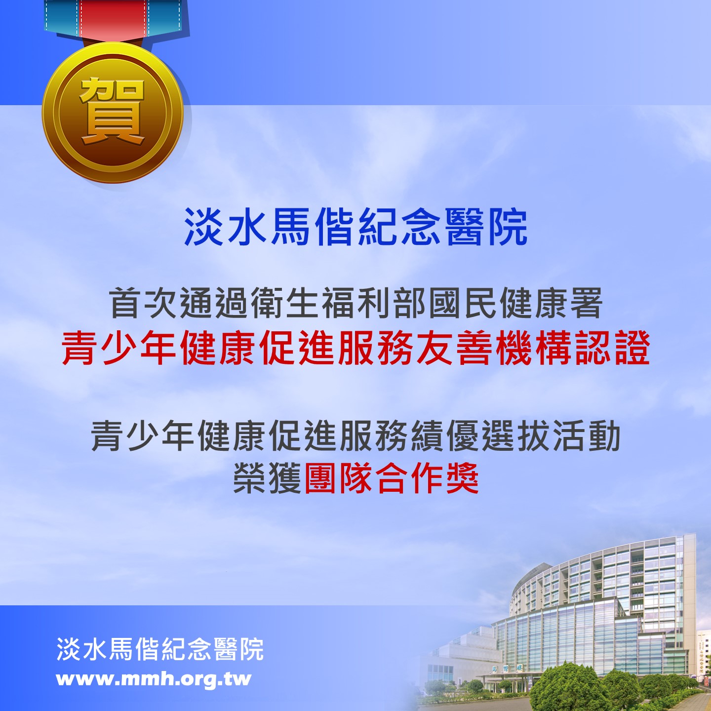 淡水馬偕紀念醫院於今年首次通過衛生福利部國民健康署「青少年健康促進服務友善機構認證」,肯定本院在推動青少年健康照護、友善就醫環境與跨團隊合作上的努力。