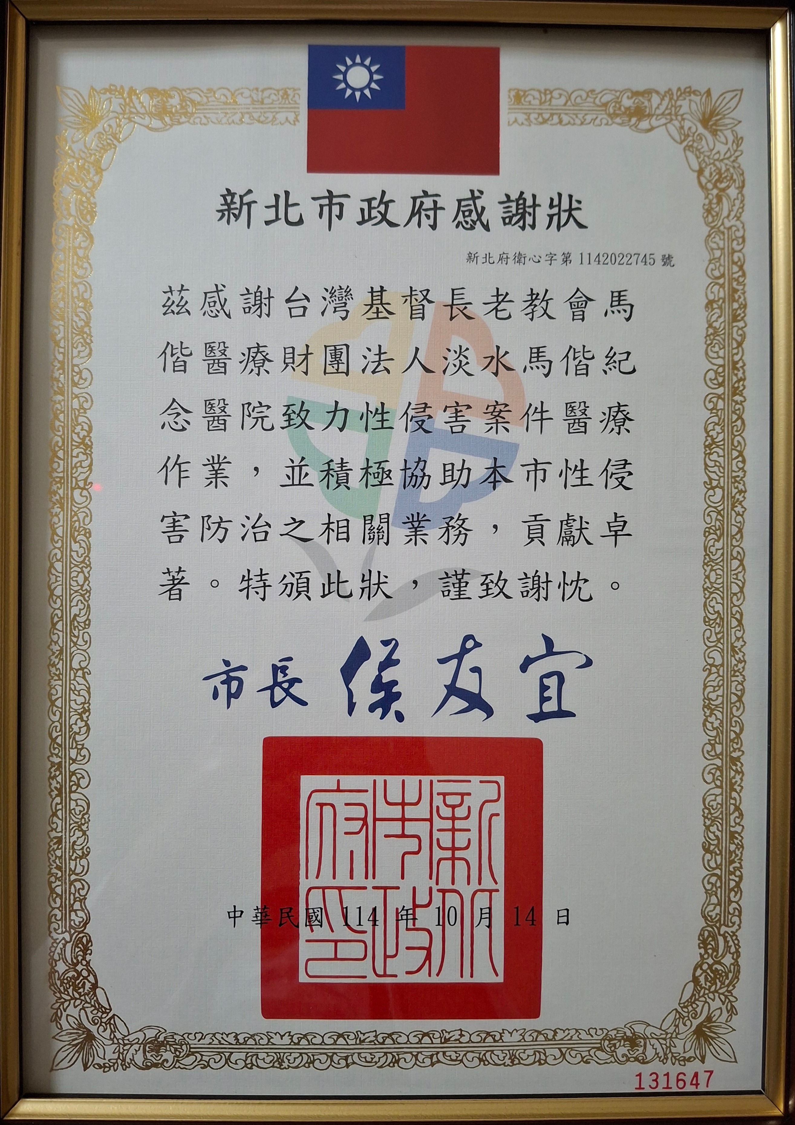 新北市政府表示,淡水馬偕紀念醫院多年來積極協助性侵害案件被害人醫療作業,並配合公共衛生政策推動,在提升被害人服務效能、強化整體防治體系上貢獻良多,對地方公共衛生與社會安全具有重要意義。