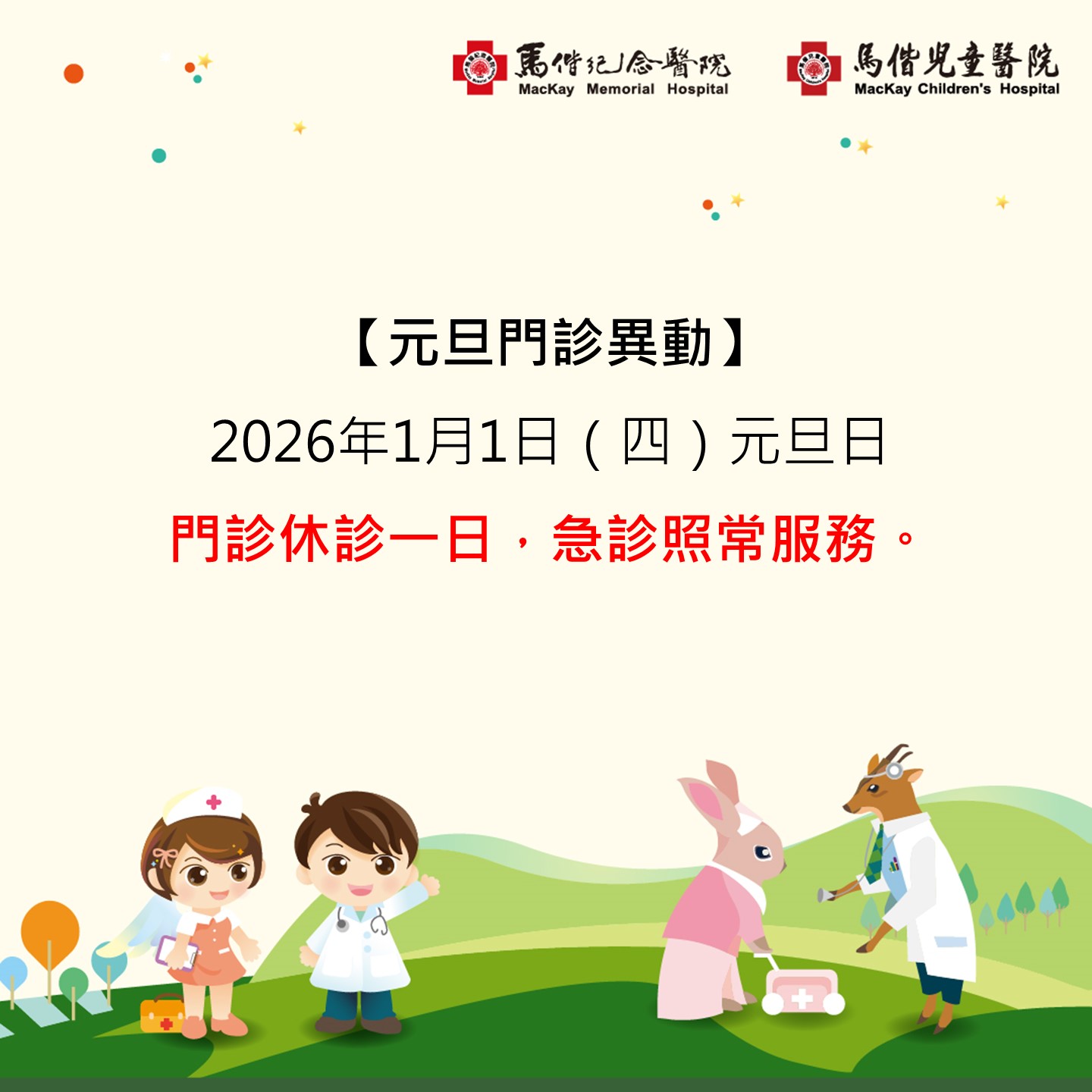 【元旦日門診異動】2026年1月1日(四),門診休診一日,急診照常服務。