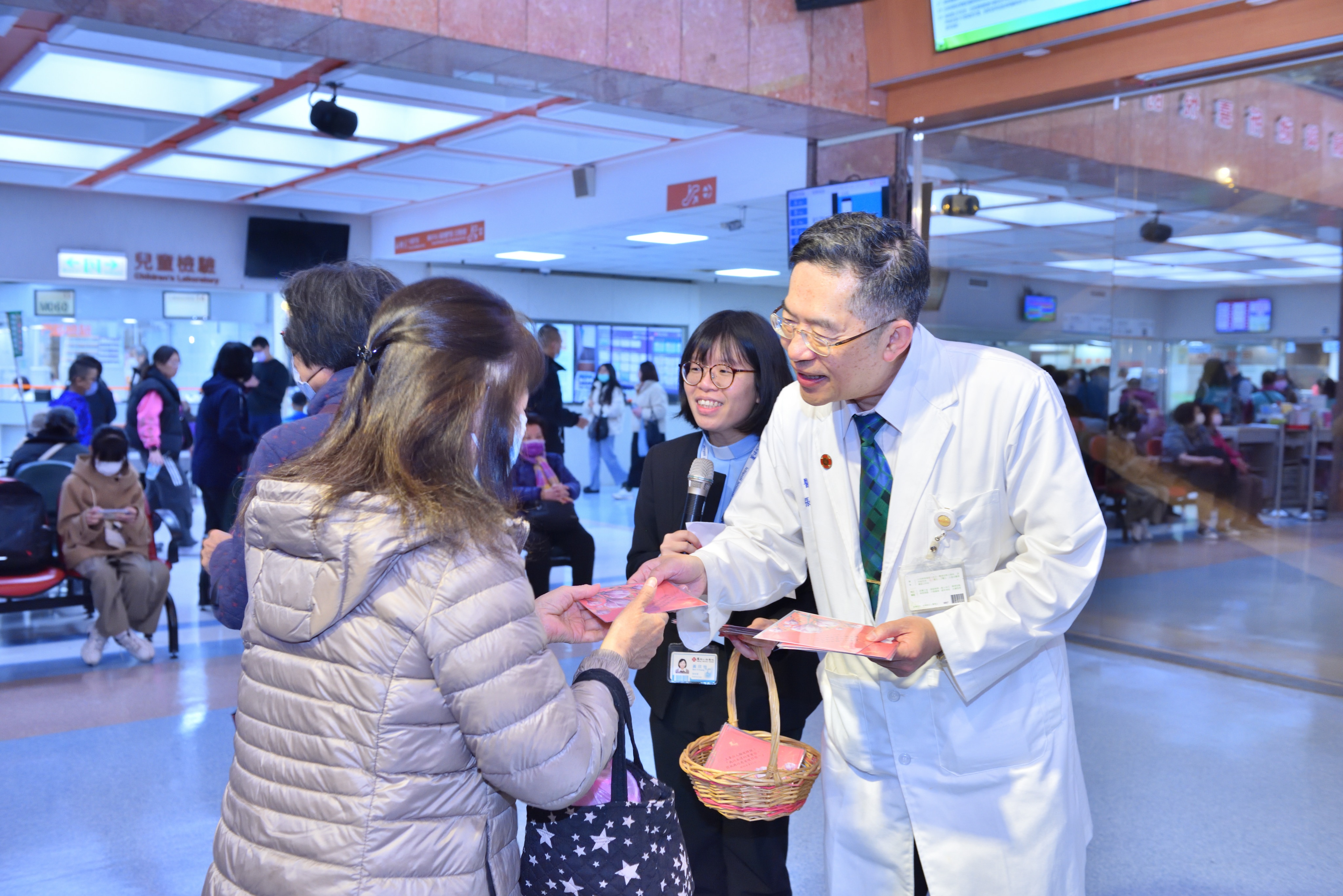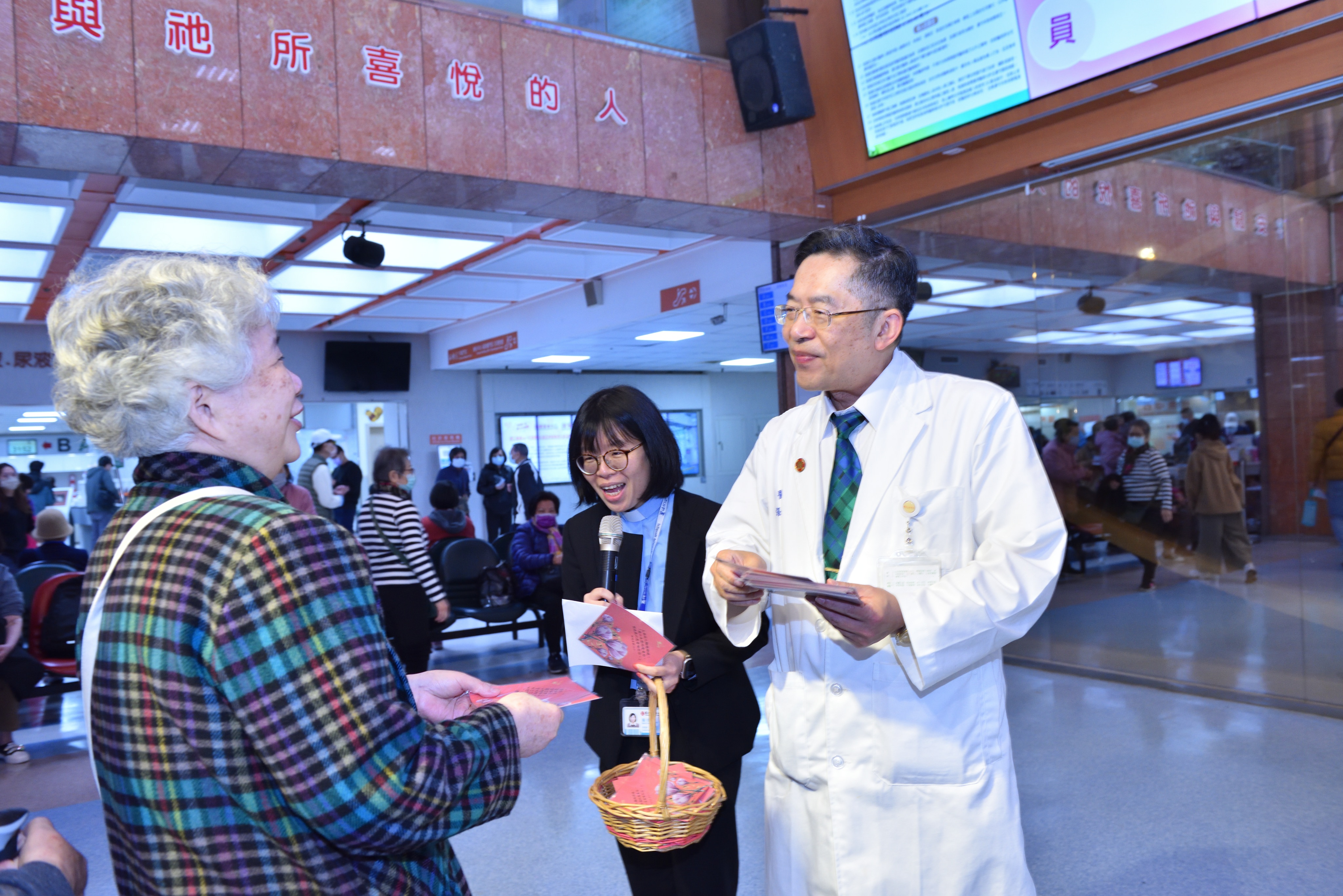 ▲馬偕紀念醫院總院長張文瀚(中)將以「木蓮」為主題設計的春聯發送給前來就醫的民眾與醫院同仁。