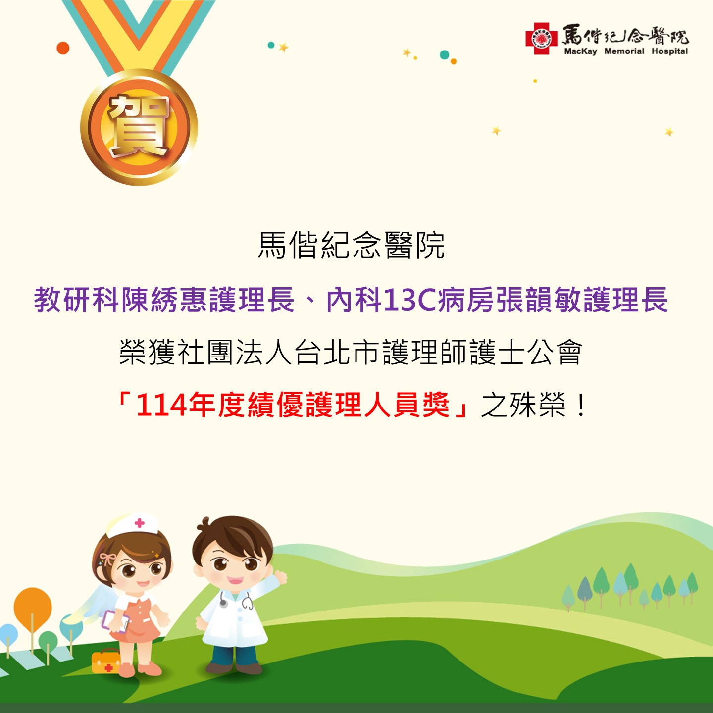 賀!馬偕紀念醫院教研科陳綉惠護理長、內科13C病房張韻敏護理長,榮獲社團法人台北市護理師護士公會「114年度績優護理人員獎」。