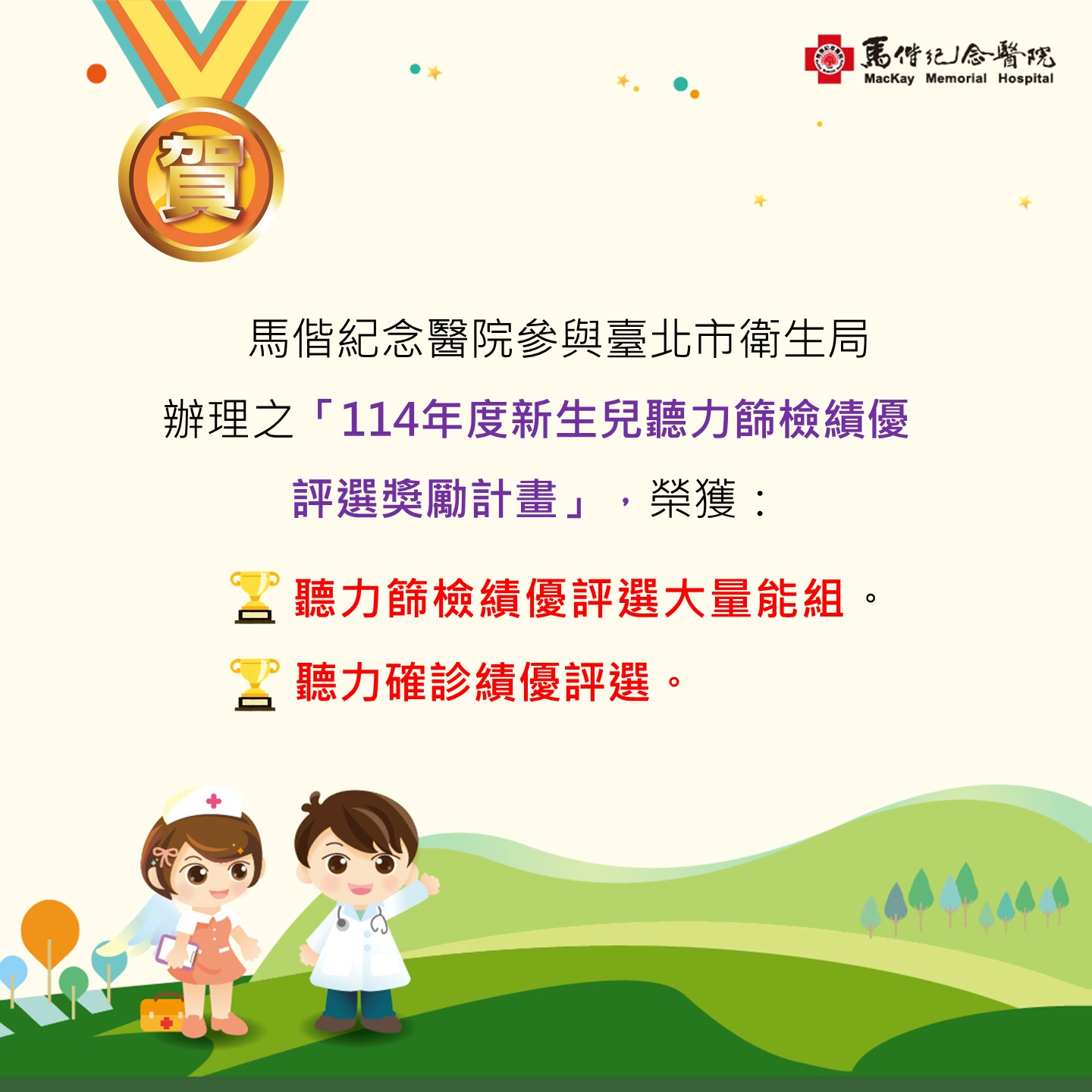 賀!馬偕紀念醫院參與臺北市衛生局辦理之「114年度新生兒聽力篩檢績優 評選獎勵計畫」,榮獲「聽力篩檢績優評選大量能組」、「聽力確診績優評選」。