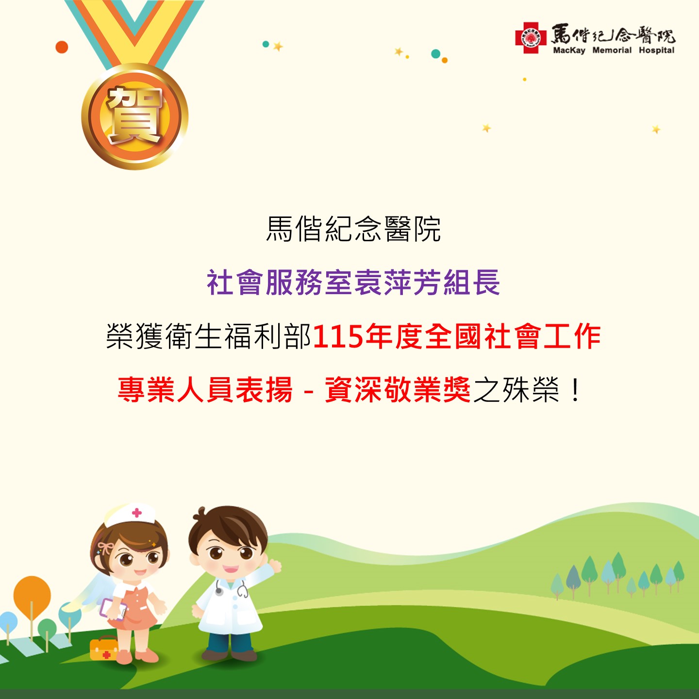 賀!馬偕紀念醫院社會服務室袁萍芳組長,榮獲衛生福利部115年度全國社會工作專業人員表揚-資深敬業獎。