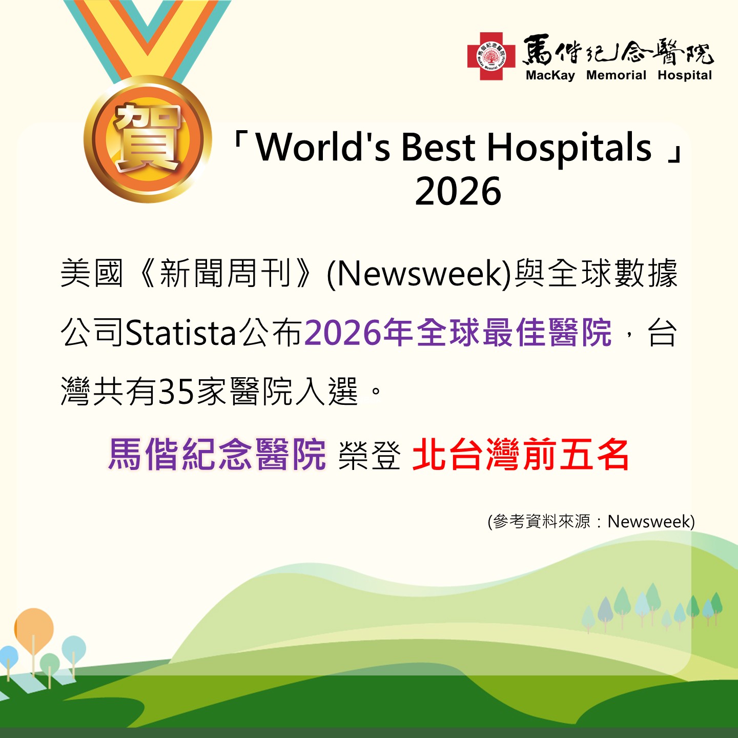 賀!美國新聞週刊Newsweek與全球數據公司Statista公布2026全球最佳醫院評比,馬偕紀念醫院榮登北台灣前五名。