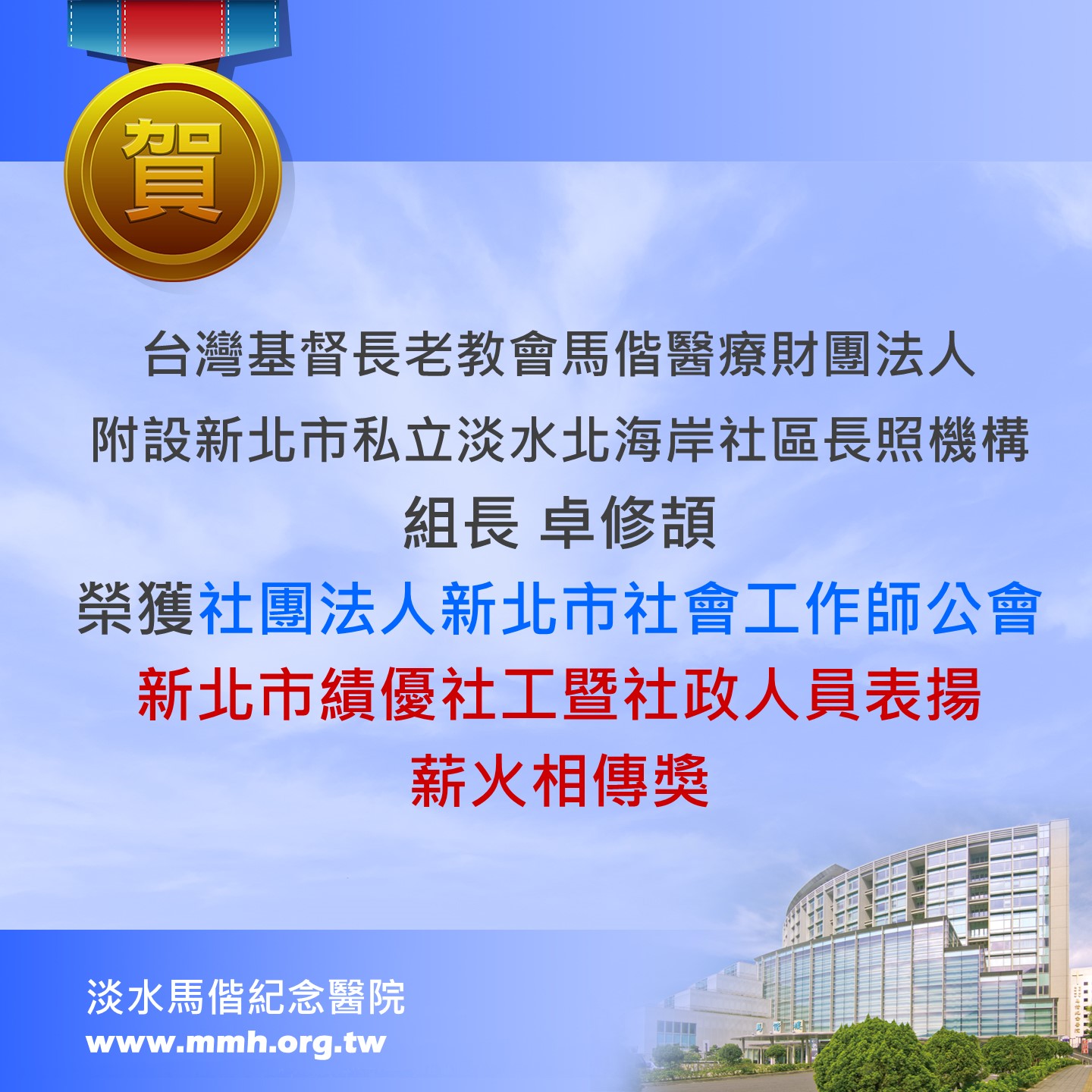 賀!台灣基督長老教會馬偕醫療財團法人附設新北市私立淡水北海岸社區長照機構卓修頡組長組長榮獲社團法人新北市社會工作師公會「新北市績優社工暨社政人員表揚~薪火相傳獎」!