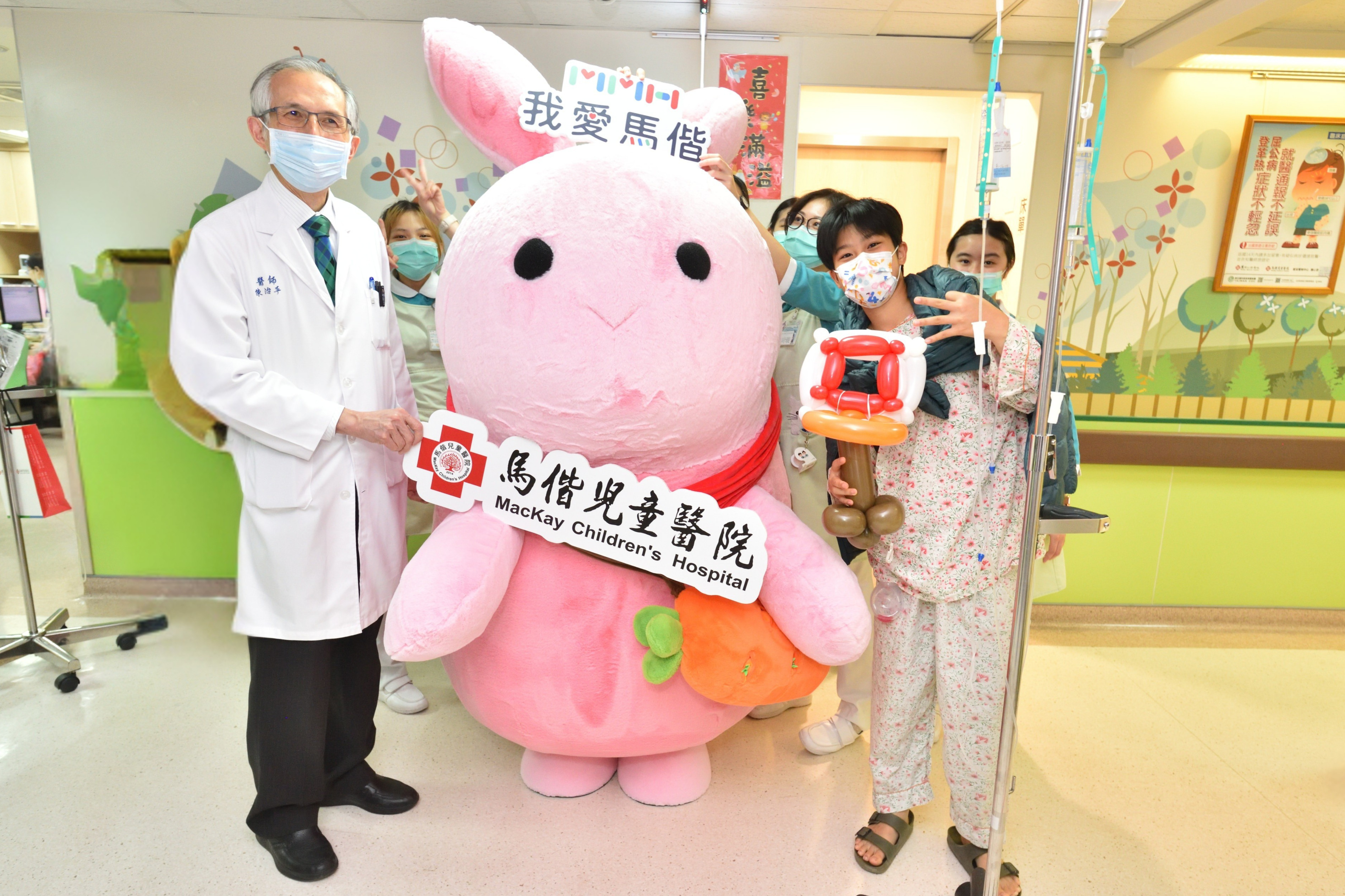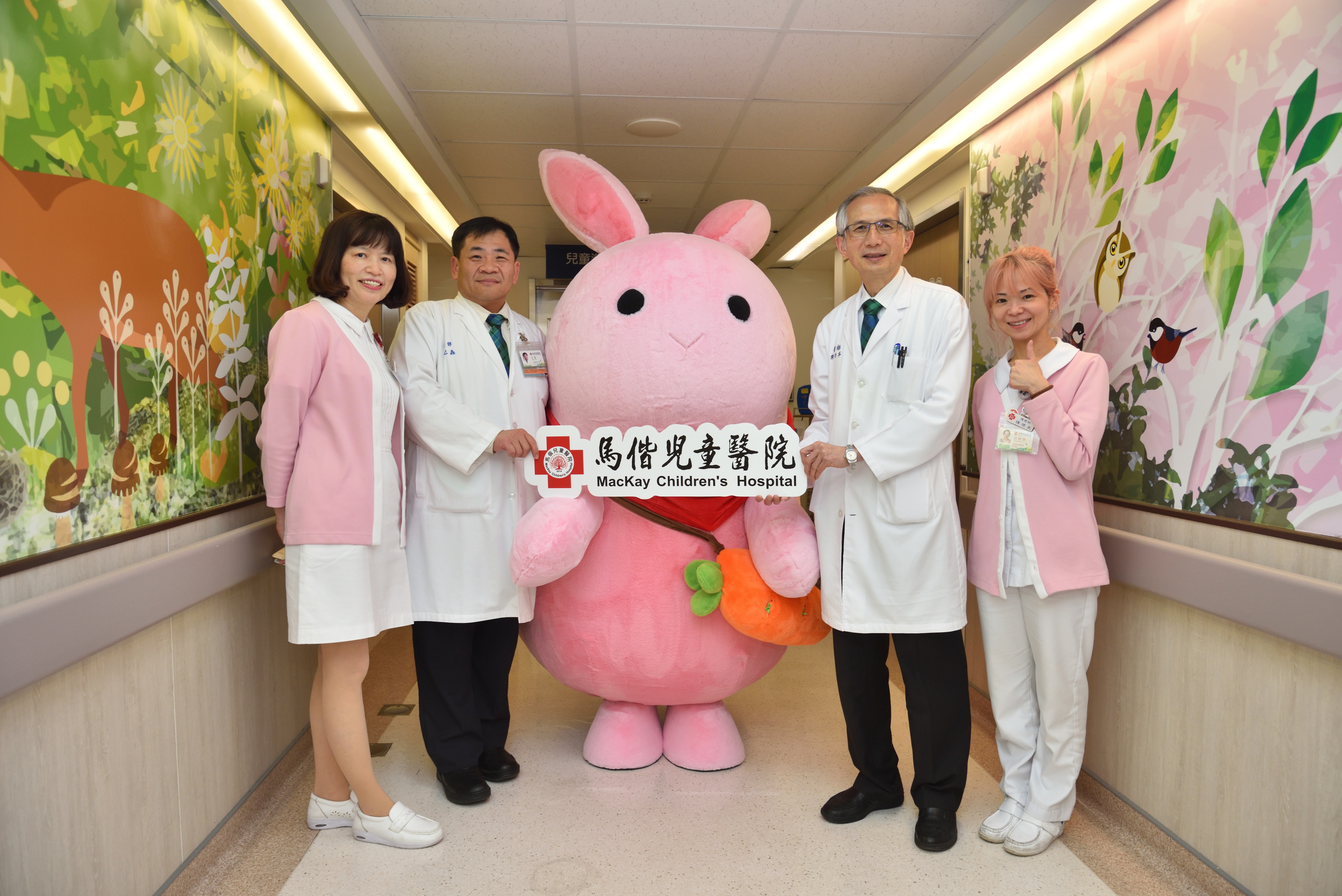 ▲ 馬偕兒童醫院吉祥物「棉花糖兔兔」首次亮相,由馬偕兒童醫院院長陳治平(右2)與兒童醫務部部長紀鑫(左2)陪同傳送「愛與勇氣」。