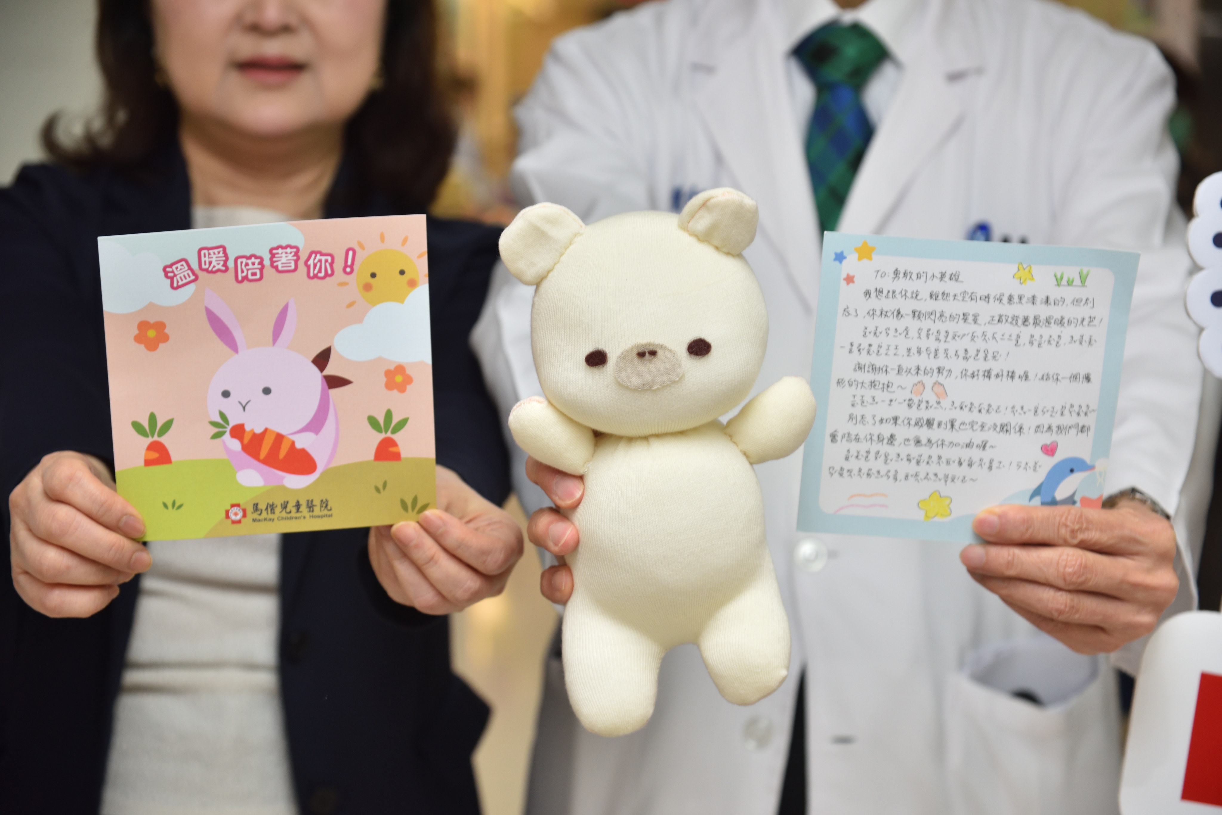 兒童節連假即將到來,馬偕兒童醫院於今(2)日舉辦兒童節系列慶祝活動,上午由兒童發展暨早期療育評估中心帶領家長與孩子進行「慢飛天使繪本闖關」活動,下午則由馬偕兒童醫院院長陳治平帶領軟萌的吉祥物「棉花糖兔兔」走入門診與病房接力送暖,為病童送上祝福與歡笑。