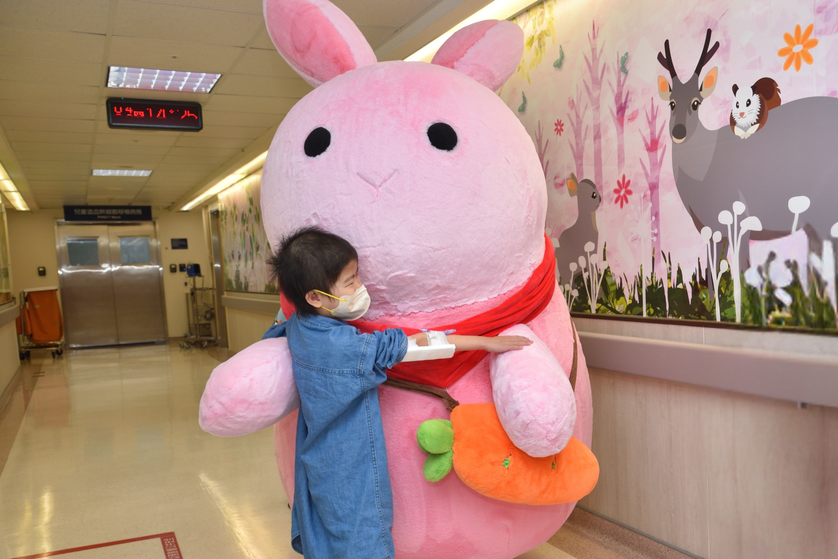 ▲ 剛接受完治療的小病童向「棉花糖兔兔」討安慰,愛的抱抱讓他重新獲得勇氣與力量。