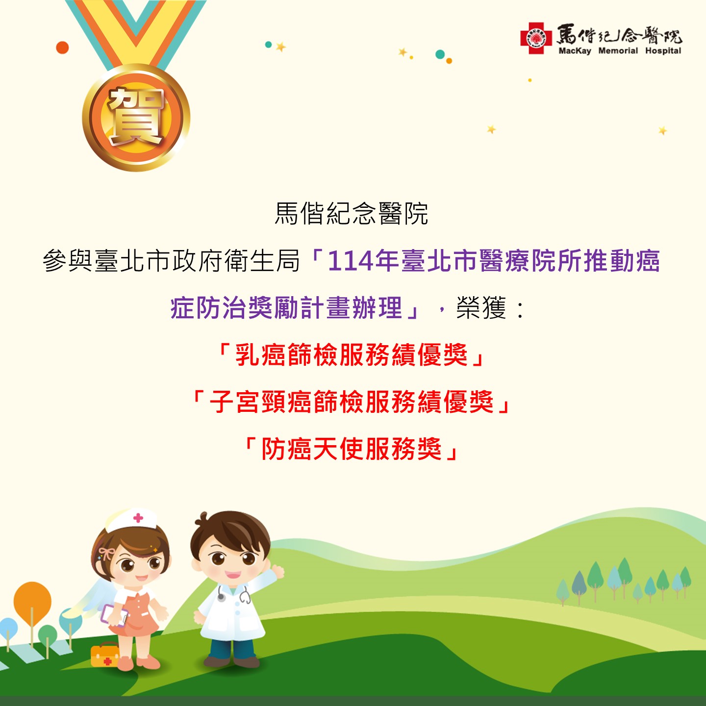 賀!馬偕紀念醫院參與臺北市政府衛生局「114年臺北市醫療院所推動癌症防治獎勵計畫辦理」,榮獲:「乳癌篩檢服務績優獎」、「子宮頸癌篩檢服務績優獎」、「防癌天使服務獎」。