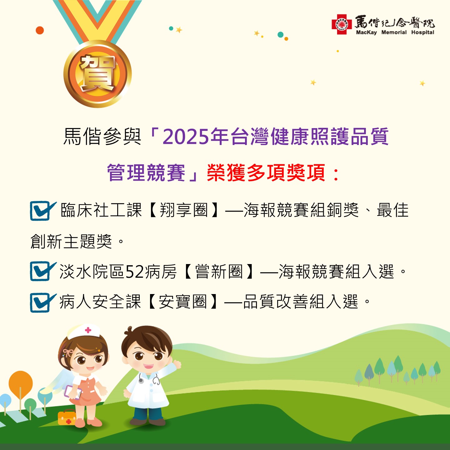 賀!馬偕紀念醫院參與「2025年台灣健康照護品質 管理競賽」榮獲多項獎項:臨床社工課【翔享圈】—海報競賽組銅獎、最佳創新主題獎;淡水院區52病房【嘗新圈】—海報競賽組入選;病人安全課【安寶圈】—品質改善組入選。