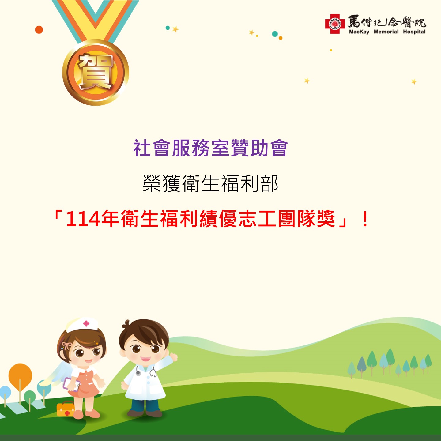 賀!馬偕紀念醫院社會服務室贊助會,榮獲衛生福利部 「114年衛生福利績優志工團隊獎」。