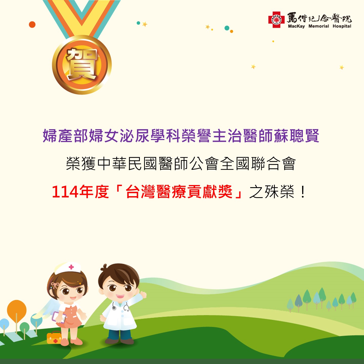 賀!馬偕紀念醫院婦產部婦女泌尿學科榮譽主治醫師蘇聰賢,榮獲中華民國醫師公會全國聯合會114年度「台灣醫療貢獻獎」。