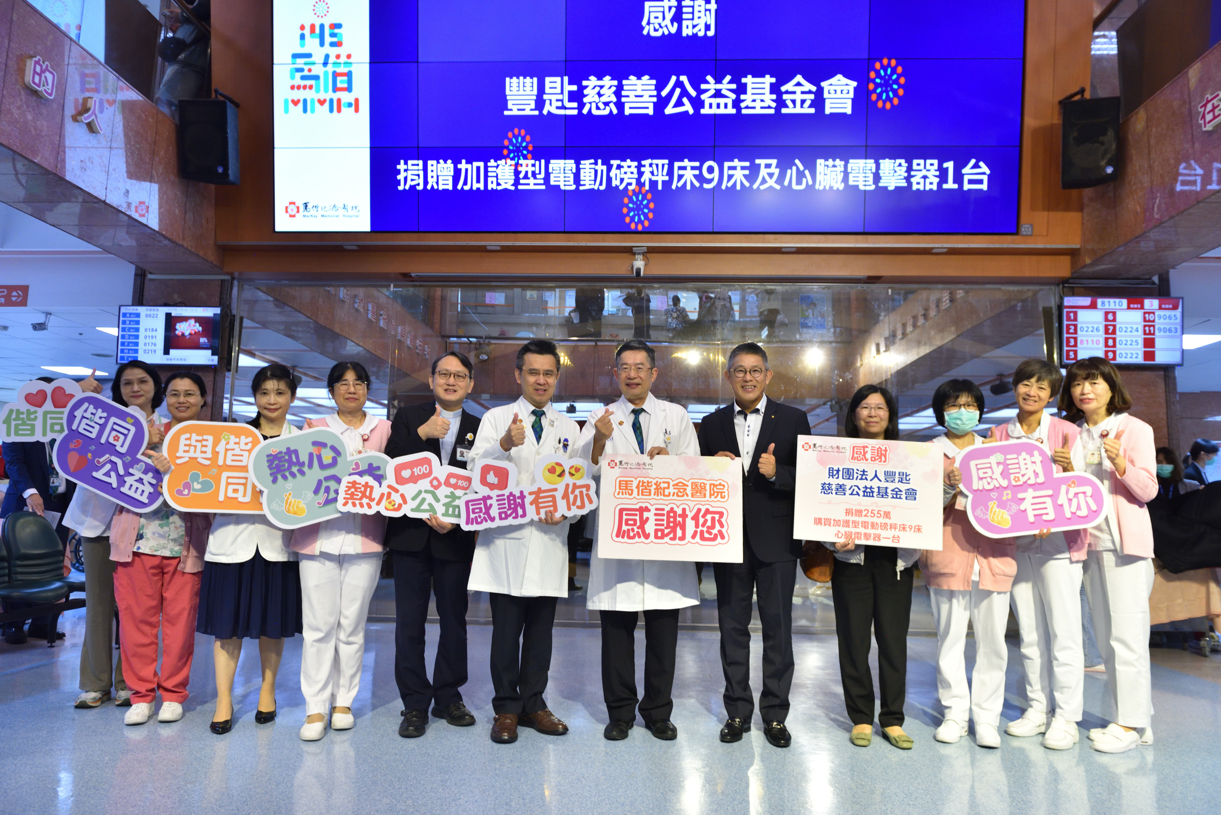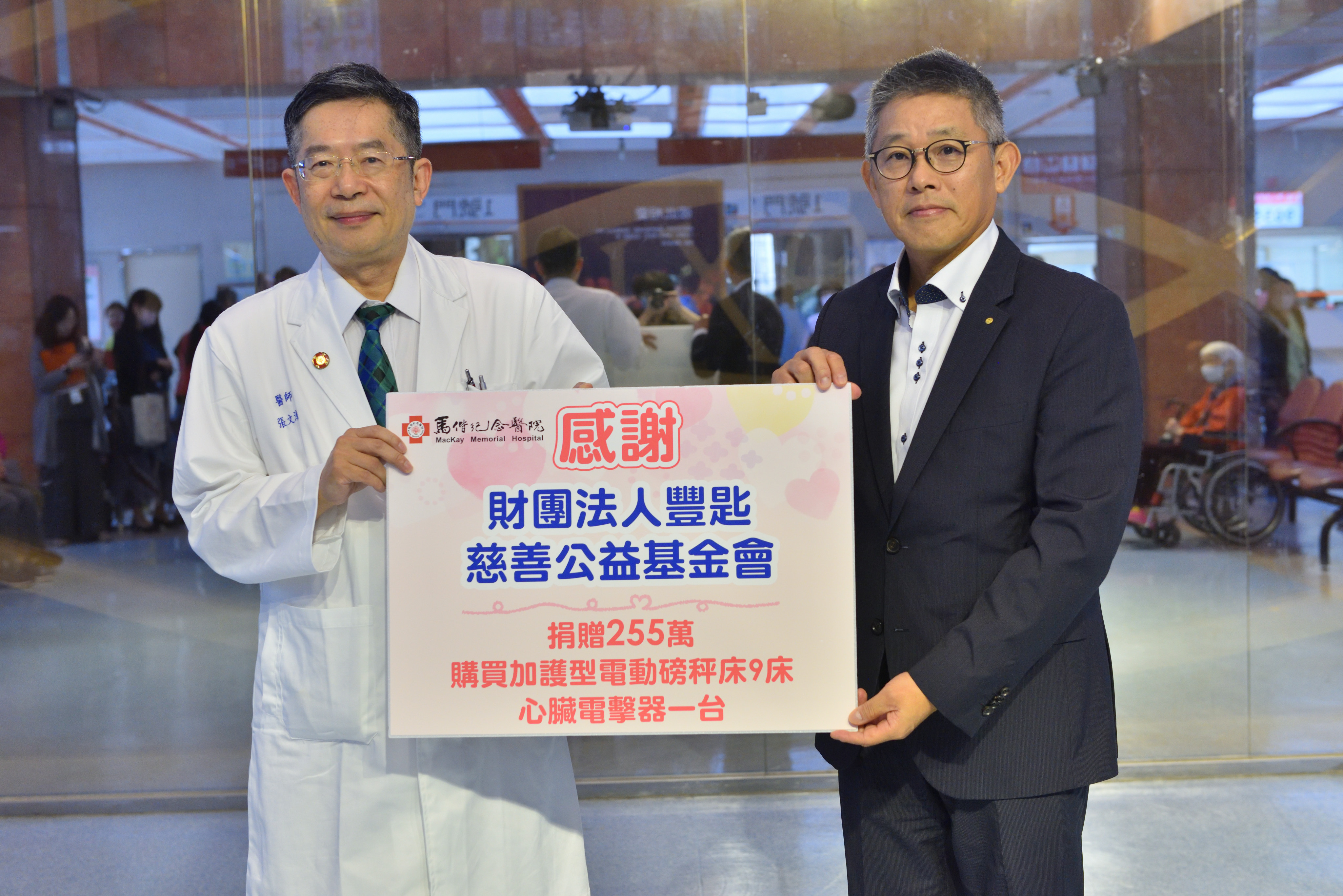 馬偕紀念醫院今(3)日舉行受贈儀式,由豐匙慈善公益基金會捐贈馬偕紀念醫院加護型電動磅秤病床九座以及心臟電擊器一台,總價值達255萬元。