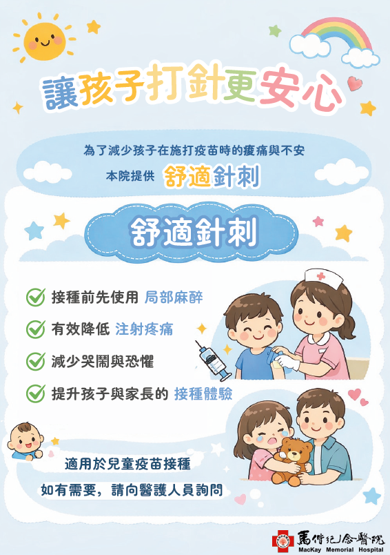 為減少孩子在施打疫苗時的痠痛與不安,淡水院區兒科健兒門診提供「舒適針刺」自費服務項目,如有需要,請向醫護人員詢問。
