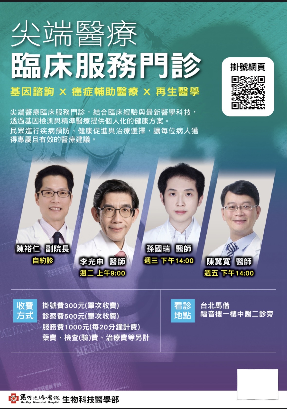 生物科技醫學部成立了「尖端醫療門診」,本科的各領域高度專業的醫師團隊提供最新醫療科技,讓民眾在醫療與保健之間,找到最合適的健康管理方式。 服務項目包括基因諮詢、再生醫學、癌症輔助治療