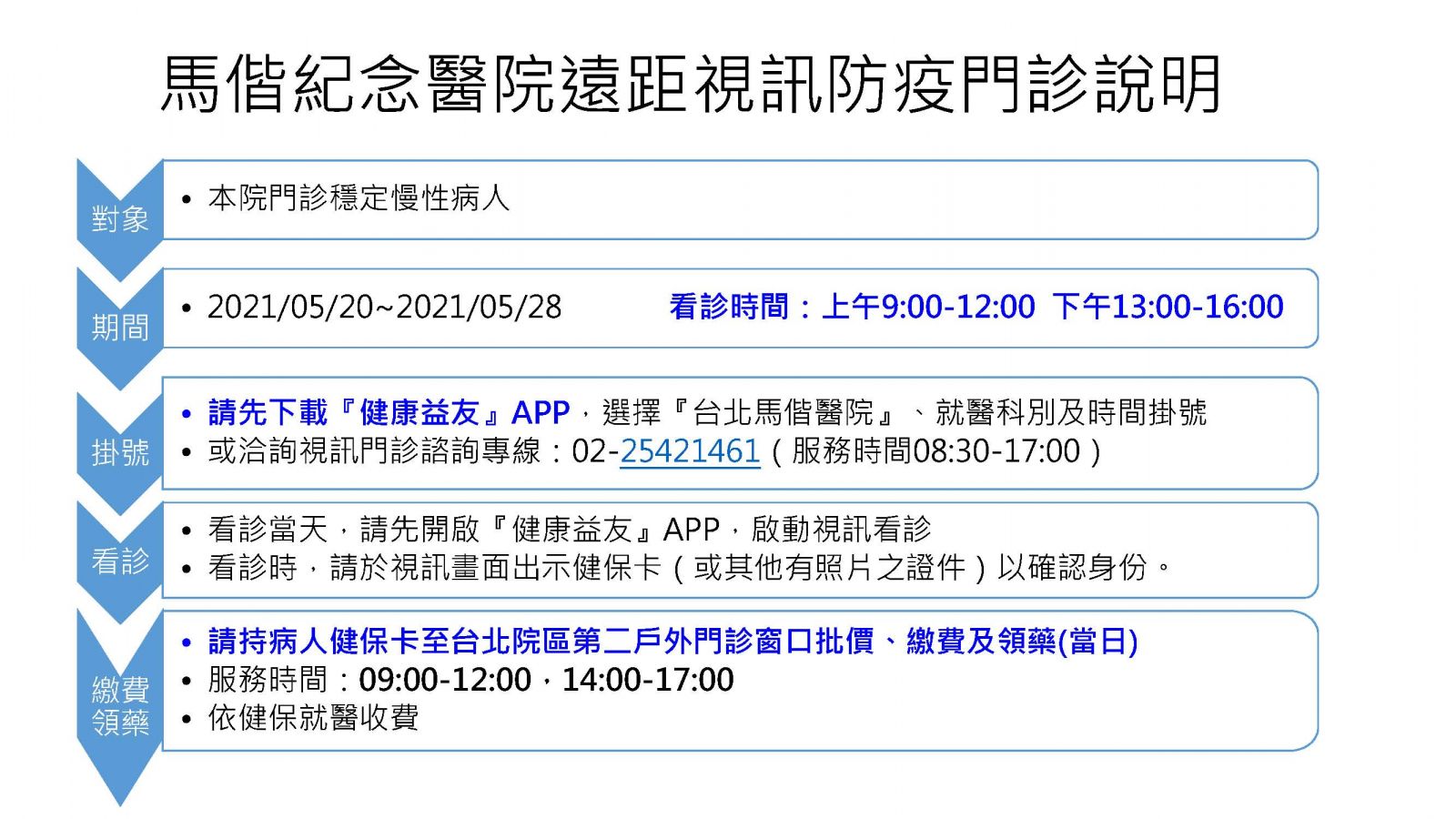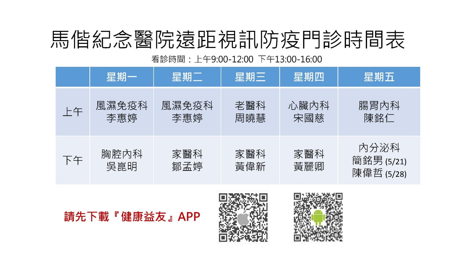 1.因應COVID-19疫情,本院提供遠距視訊防疫門診服務,適用對象為本院門診穩定慢性病人,掛號方式詳如附檔說明,歡迎多加利用。